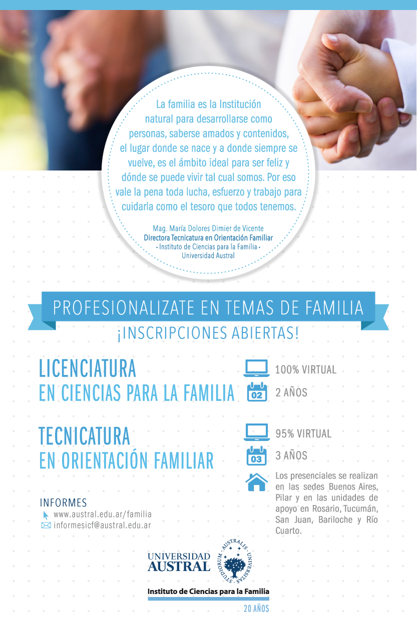Una sociedad no se comprende a espaldas de la familia, pero tampoco se comprende una familia sin una sociedad en la cual insertarse. Familia y sociedad se implican y retroalimentan mutuamente. Por lo tanto, si buscamos la mejora de la sociedad, el protagonismo familiar es fundamental. Desafío que compete especialmente a los Técnicos en Orientación Familiar, carrera que se dicta en el Instituto de Ciencias para la Familia de la Universidad Austral y que ya cuenta con la 7° promoción, preparando profesionales especialistas en temas de familia, insertos laboralmente en diferentes ámbitos educativos, sociales, de la salud, judiciales, etc.