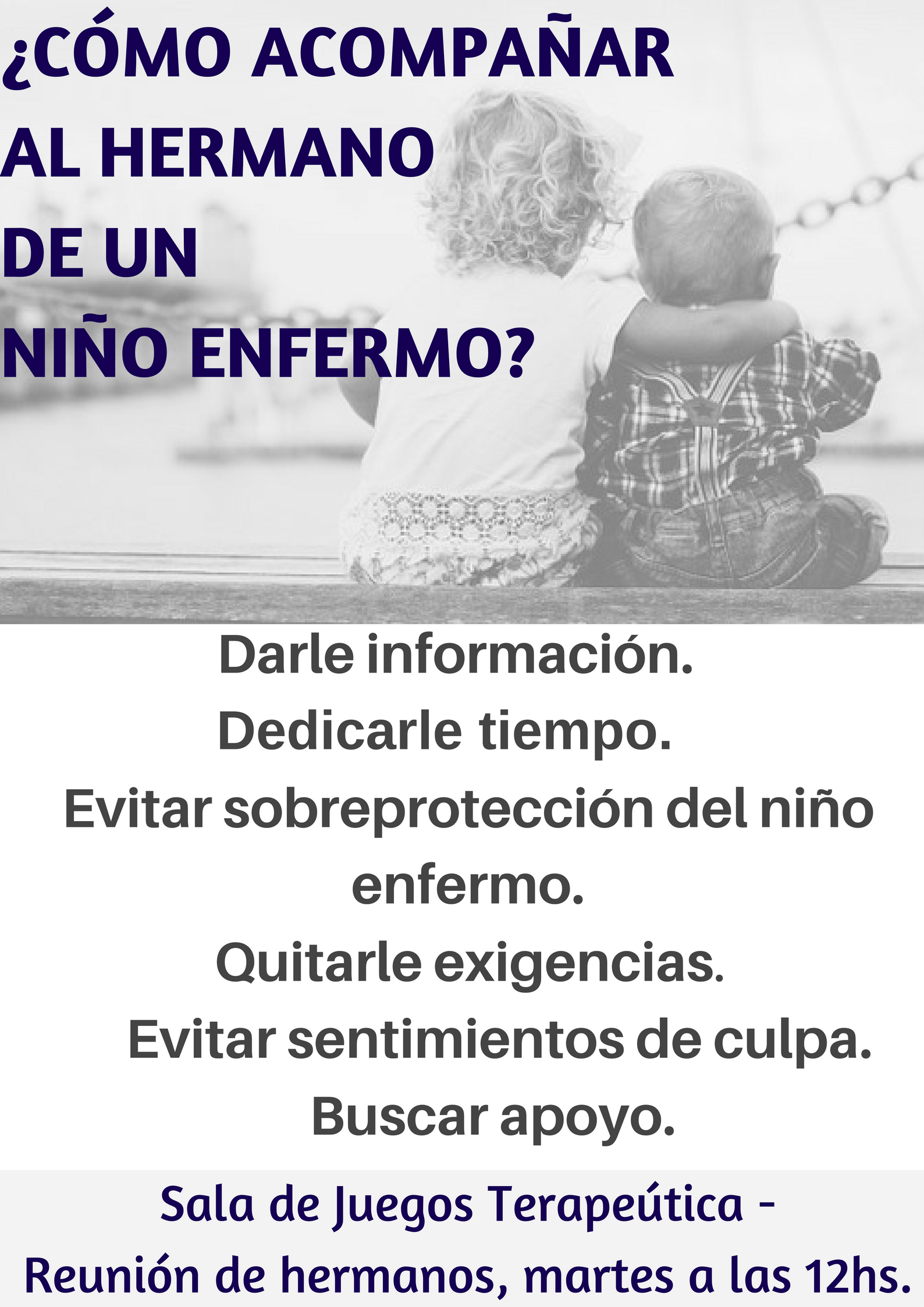 El equipo de especialistas ofrece un horario semanal exclusivo para hermanos los días martes a las 12 hs, guiado por una Psicóloga. “Hablamos sobre lo que le está sucediendo a sus hermanos internados, las enfermedades que tienen y qué significan, cómo son los tratamientos, qué son todos los aparatos médicos y los procedimientos que se deben realizar y cómo son los cambios que están atravesando en su vida, entre otras cuestiones”, completó la licenciada.
