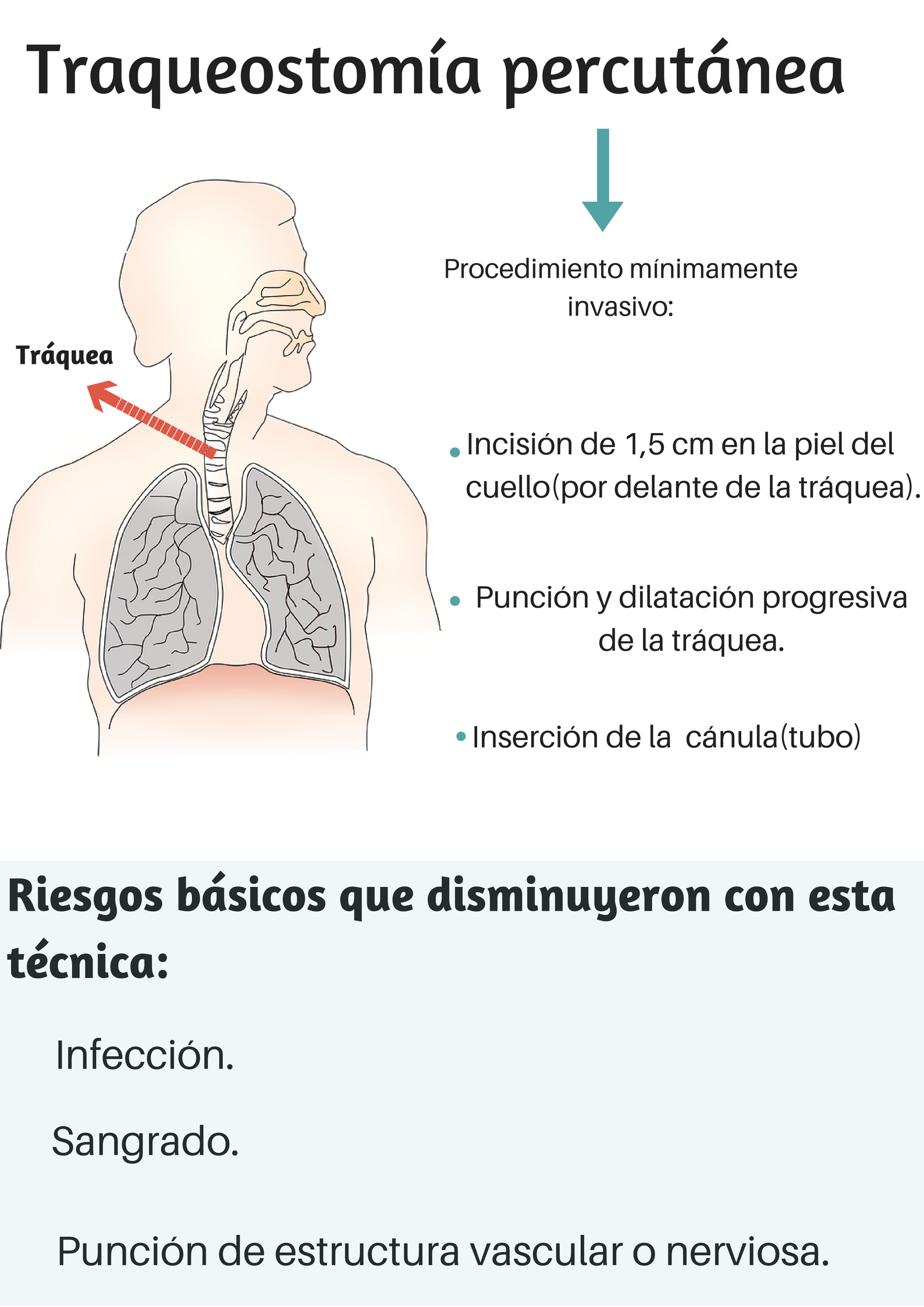 mía Percutánea, que consiste en la dilatación progresiva de la tráquea y la posterior inserción de la cánula. Esta técnica favorece la recuperación de los tejidos una vez retirada la cánula, y es de elección por ejemplo, para los pacientes con ventilación mecánica prolongada (más de 2 semanas en promedio).