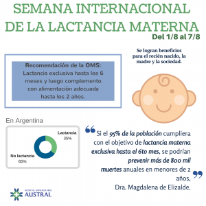 “En el Hospital Austral trabajamos cotidianamente promoviendo la lactancia materna no solo en los recién nacidos sanos, sino también en los recién nacidos prematuros y los que tienen que ser separados de su madre por presentar alguna patología o necesidad especial de cuidados”, mencionó la especialista. Y agregó: “creemos que el lema de este año refleja algo que es fundamental e imprescindible para que se pueda lograr una buena lactancia: la creación de alianzas y redes de contención entre las madres, con el personal de salud, con las familias, abuelas, en los lugares de trabajo, en la sociedad. Creemos que falta mucho para llegar al ideal, y que es necesario un trabajo que involucre a toda la sociedad”.