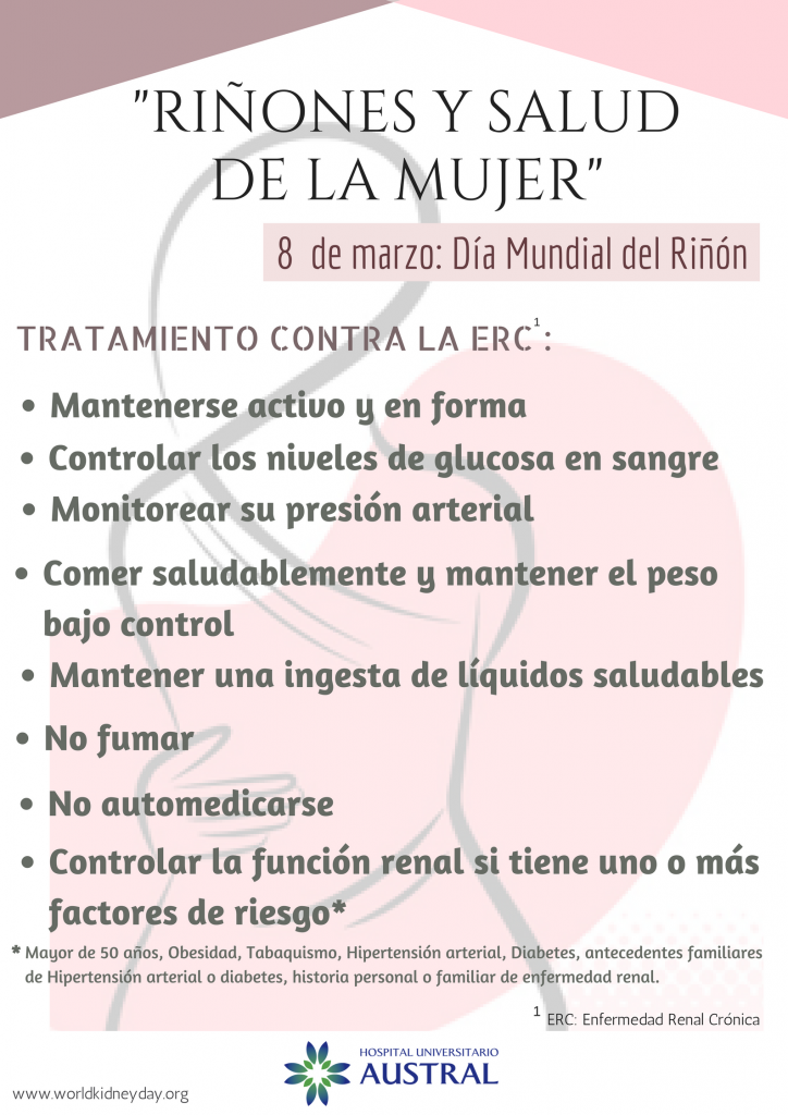 Según la Campaña Global World Kidney Day, la Enfermedad Renal Crónica (ERC) es el “mal funcionamiento de los riñones por varios meses o años. Lo padecen 1 de cada 10 personas en el mundo y no presenta síntomas”. Este año, en el Día Mundial del Riñón que se celebra desde el 2006, el lema es “Riñones y Salud renal de la mujer” con el objetivo de concientizar sobre la prevención de las enfermedades renales en el Día Internacional de la Mujer.