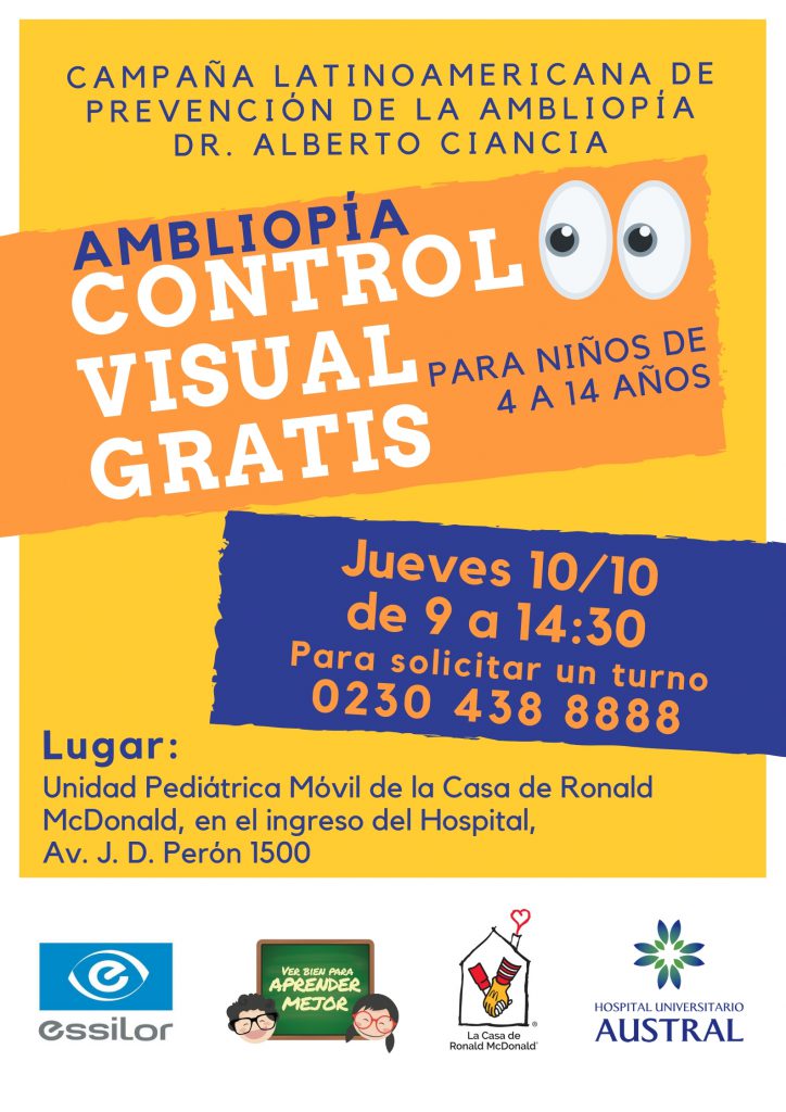 El Hospital Universitario Austral realizará controles gratuitos para detectar la ambliopía en niños de 4 a 14 años en el marco de la Campaña Latinoamericana de Prevención de esta patología. Será de 9 a 14:30, con turno previo, en la Unidad Pediátrica Móvil de la Casa de Ronald McDonald en el ingreso del Hospital Austral (sobre acceso Av. Perón).