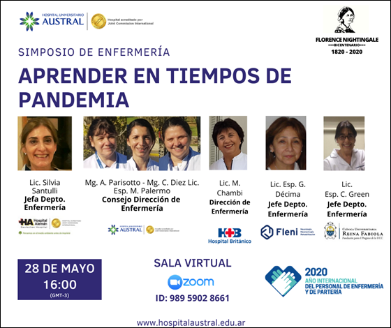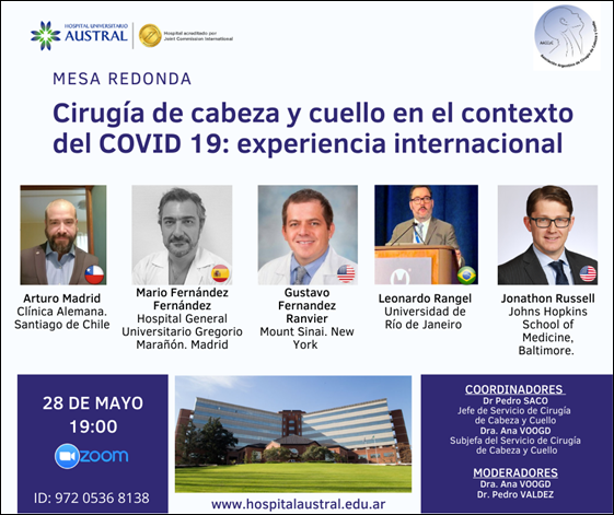 El primer encuentro del día será a las 16 y será el Simposio de Enfermería «Aprender en tiempos de pandemia» organizado por la Dirección de Enfermería del Hospital Universitario Austral. Horas más tarde, a las 19, comenzará la mesa redonda «Cirugía de cabeza y cuello en el contexto del COVID-19: experiencia internacional», que contará con la coordinación del Servicio de Cirugía de Cabeza y Cuello.