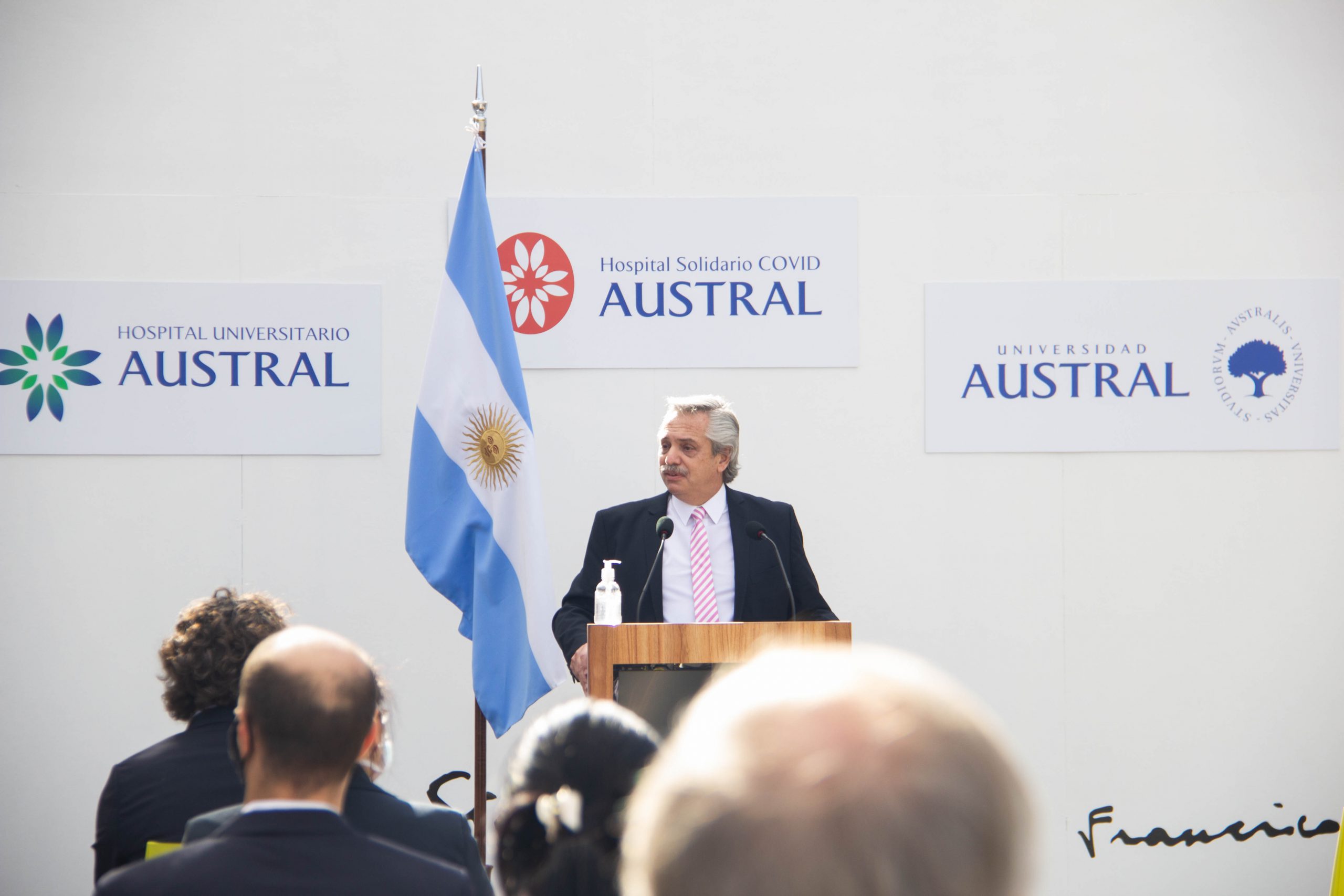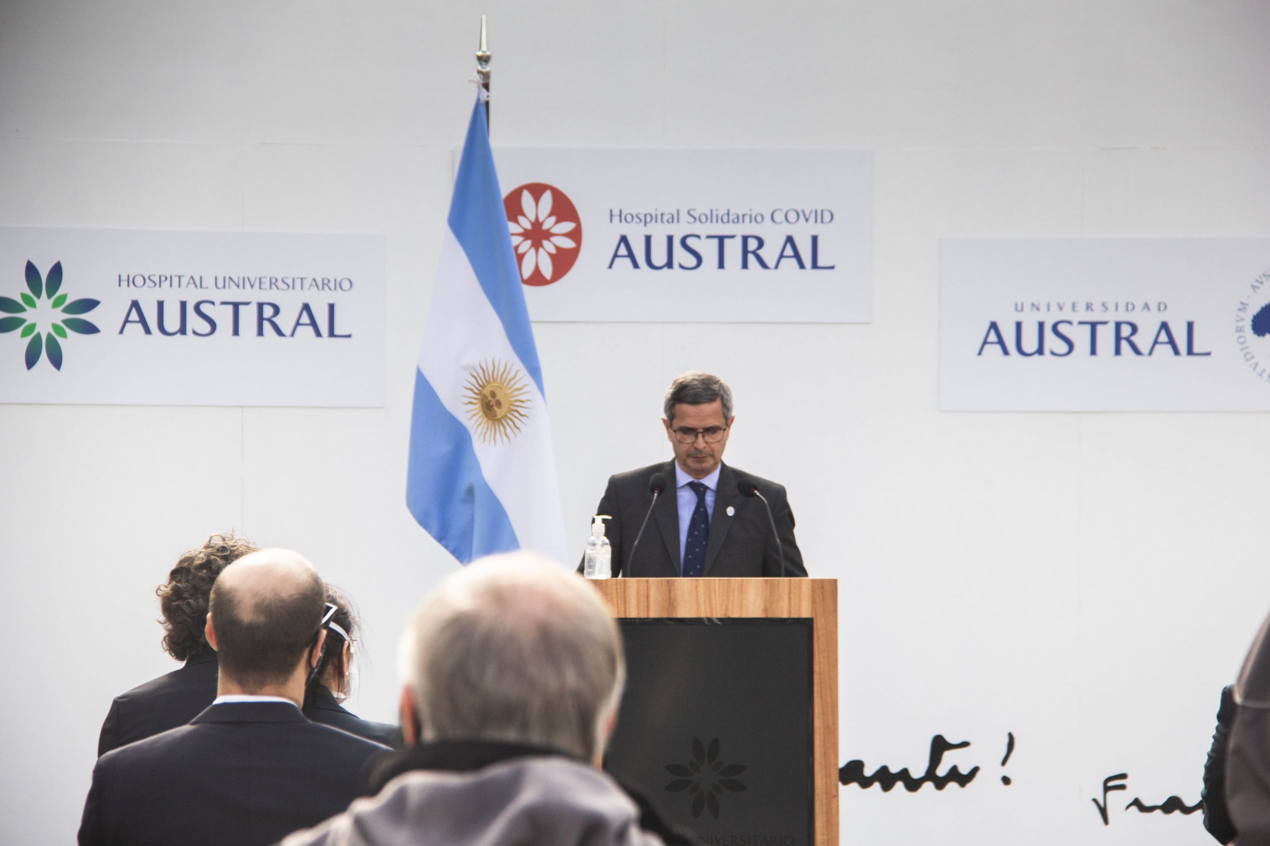 El Hospital Solidario COVID Austral está emplazado en el Campus universitario de Pilar y consta de 60 camas para pacientes que requieren cuidados de alta complejidad, que se irán habilitando en la medida en que crezca la demanda. Fue construido en dos meses en instalaciones ya existentes del Hospital Universitario Austral, que fueron acondicionadas para su nueva función. Se trata de un espacio acondicionado con 20 Camas de Terapia Intensiva, 24 Camas de Terapia Intermedia y 16 Camas de Pre alta para pacientes COVID-19. El Presidente puso de manifiesto el hecho de que se hayan creado tantas camas para la atención solidaria como las que hay en las salas de cuidados críticos en el Hospital Austral.