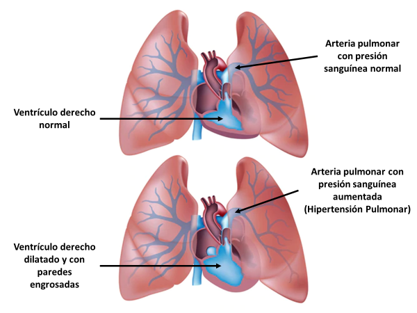 La presión en la arteria pulmonar aumenta debido a la mayor resistencia que se presenta en el pasaje de la sangre a través del árbol vascular pulmonar. “Así, el ventrículo derecho debe generar más potencia al contraerse, para poder vencer esa resistencia, y sufre cambios adaptativos que terminan afectando su rendimiento”.