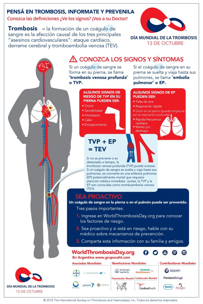 El 13 de octubre se celebra el Día Mundial de la Trombosis y este 2020 el lema es “Pensá en Trombosis”. El objetivo es concientizar sobre la formación de un trombo, coágulo de sangre en un vaso sanguíneo. “El vaso puede ser cualquier vena o arteria como, por ejemplo, en una trombosis venosa profunda o una arteria coronaria”, detallan desde la WTD.