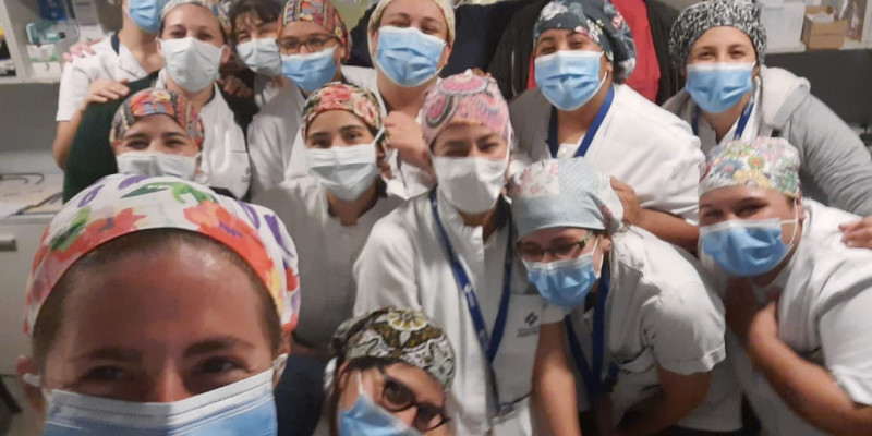 Aquí estamos. Convivimos todos los días entre la vida y la muerte. La insensibilidad pasa de largo y nuestra piel se va deshojando junto a las emociones de cada paciente. Los acompañamos en el miedo y lloramos por dentro cada vez que se quedan sin aire. Ellos se debaten entre intensiva e intermedia, mientras nosotros vemos pasar la risa de la emergencia y la sonrisa de la paciencia. Nos queda darles la mano, vaya si nos aprietan con su necesidad de salvar lo precioso de su intimidad, rogando por hacerse entender, entre muecas y labios que intentan decir aquello que queda adentro y sale sin sonido. Nos miran atravesando capas y capas de plástico solo para llegar a conectar con el espíritu enfermero que llevamos dentro y que entiende de que se trata. Sufren, y nosotros con ellos. Nuestro lenguaje, a veces, parece que es a través de la higiene y la medicación. Entre varios los tomamos de sus brazos y piernas, los pronamos y acariciamos, les hablamos al oído, y nos contestamos también, es que nos damos fuerzas a nosotros mismos para pasar un día más dejando todo por lo que nos ofrecimos. Desde temprano pensamos en ellos, vemos sus caritas imaginarias en el trayecto al solidario, es una oración constante por suplicar que se salven, porque es de un asombro y dolor injusto verlos irse por la puerta de atrás. Nos miramos sin entender el por qué, para cada uno esto es diferente y nos reinventamos nuevamente. Y volvemos una y otra vez a mirarlos por el vidrio, también los saludamos y festejamos. ¡Ahí estamos! Llega la hora de dejarlos ir y gozamos las despedidas de larguísima internación, de rehabilitación y de valorar lo sagrado que nos da la vida respiración”.
