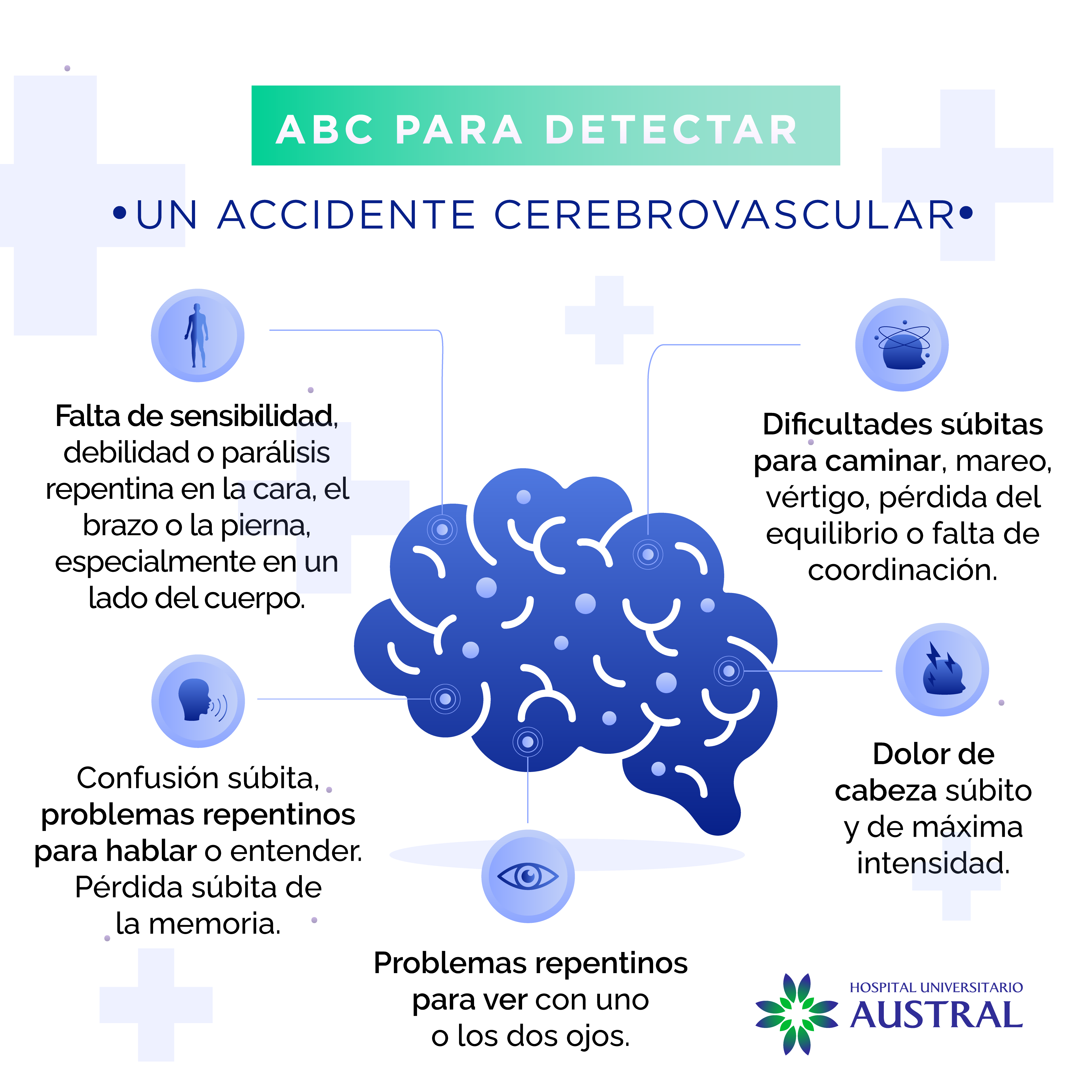 El Dr. Di Carlo aseguró que “reconocer tempranamente estos signos de alarma nos debe llevar a una única conducta que es la consulta médica urgente, que debe realizarse sin demora en una sala de emergencias o guardia del centro de salud más cercano. Esto permite al equipo de profesionales de la salud tomar conductas diagnósticas y terapéuticas adecuadas cuyo objetivo es reestablecer la circulación cerebral”.