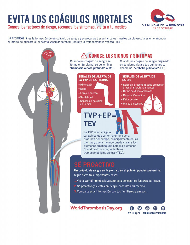 Y agregan: “La tromboembolia venosa (TEV) es una afección en la que se forma un coágulo de sangre, más frecuentemente en las venas profundas de las piernas, la pelvis o los brazos (trombosis venosa profunda o TVP), que puede trasladarse a través de la circulación y alojarse en los pulmones, afección denominada embolia pulmonar (EP). Juntas, la TVP y la EP se conocen como TEV, una afección médica peligrosa y potencialmente mortal”.