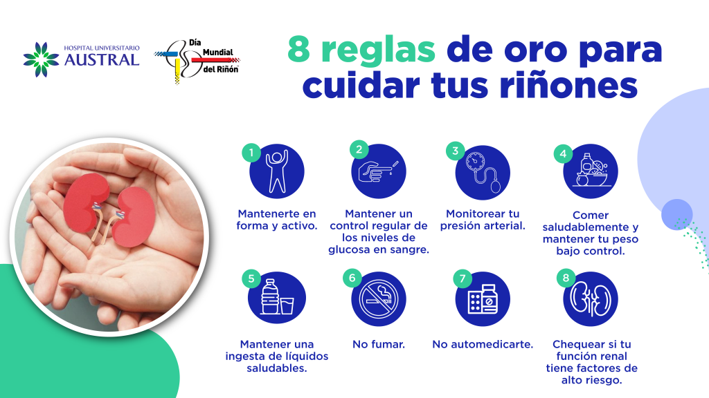 Dentro de las claves para cuidar la salud y prevenir las enfermedades renales, la WKD comparte ocho reglas de oro para cuidar los riñones:
