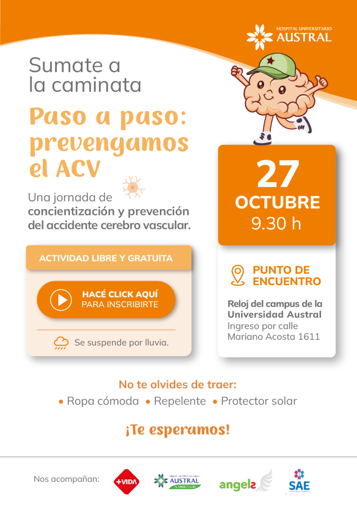 Te invitamos a participar de la caminata de 3 km que realizaremos el domingo 27 de octubre en el campus del Hospital para concientizar sobre el accidente cerebrovascular (ACV), una enfermedad que afecta a miles de personas cada año.