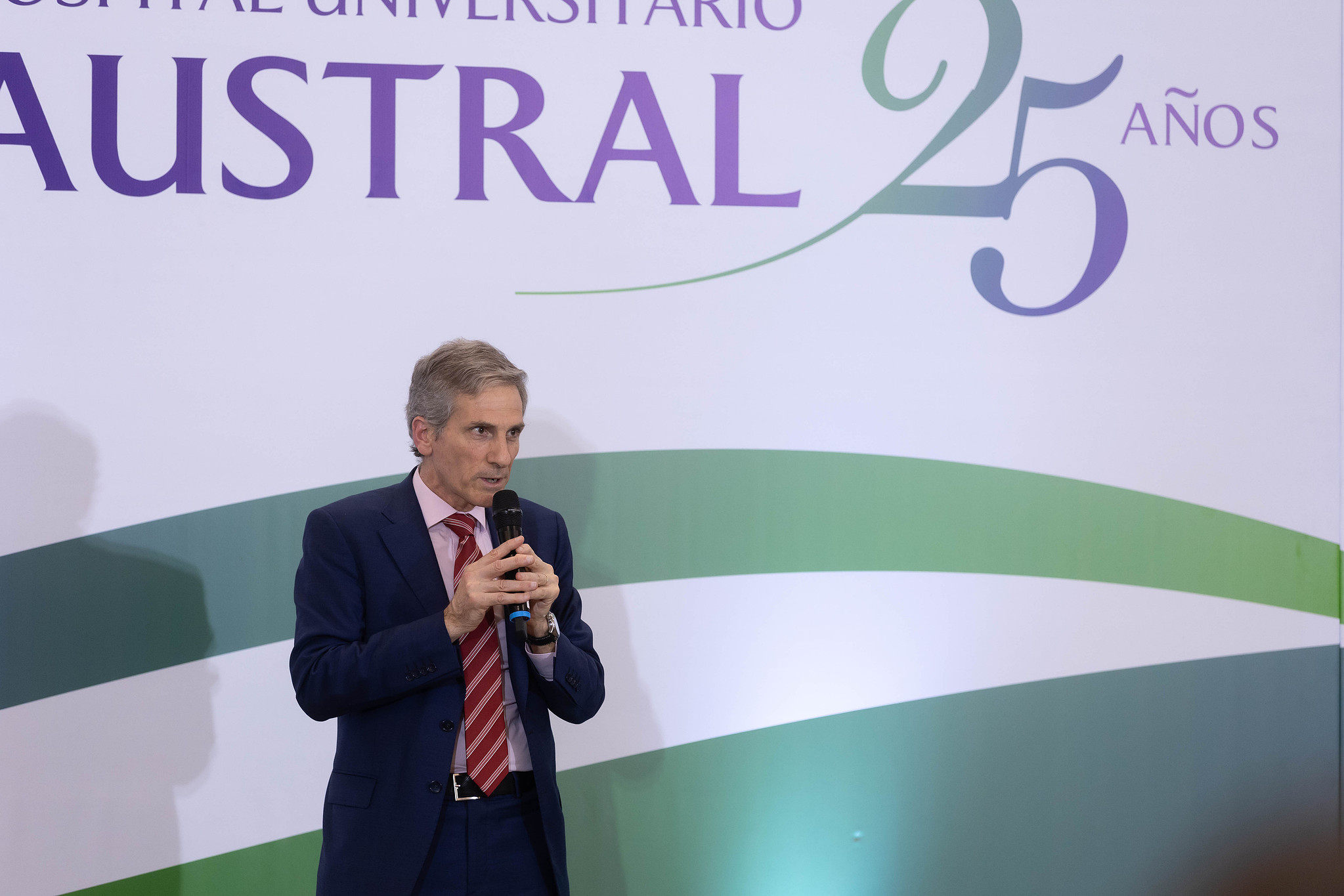 Por su parte, Julián Rodríguez, rector de la Universidad Austral, subrayó el carácter académico de la institución: “El Hospital Austral es universitario porque enseña, investiga y transfiere conocimiento. Esas tres misiones hacen a la esencia de cualquier universidad”. En ese sentido, explicó que la docencia está presente en cada rincón del hospital: basta recorrer los pasillos para ver a los alumnos junto a sus maestros y a los residentes que, además de su formación práctica, obtienen títulos de especialistas universitarios. Además, resaltó la importancia de la investigación, “no solo clínica, sino también con publicaciones de altísimo impacto internacional”. Finalmente, reafirmó la transferencia de conocimiento, que se materializa en la colaboración con otros hospitales e instituciones médicas.