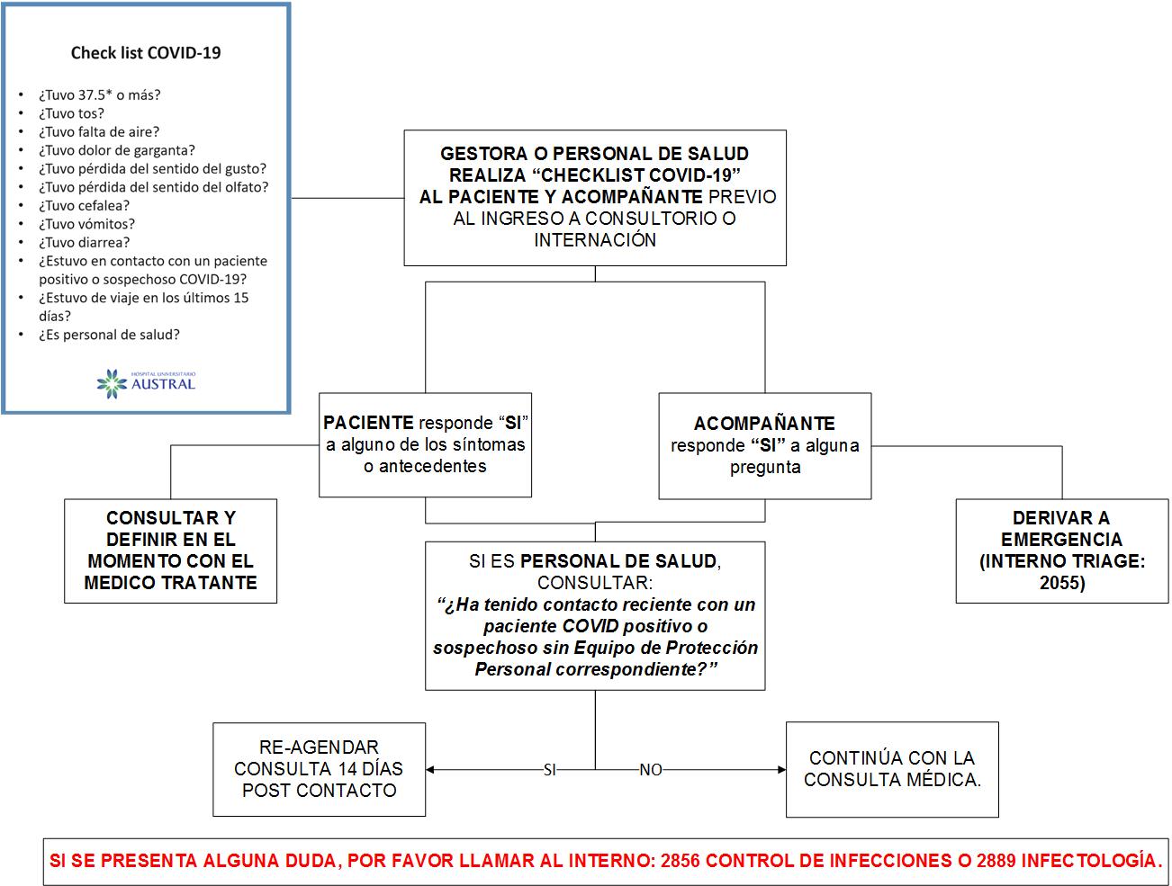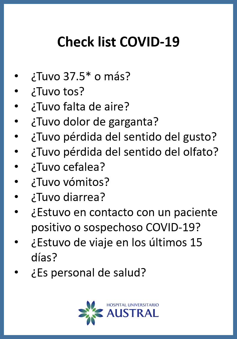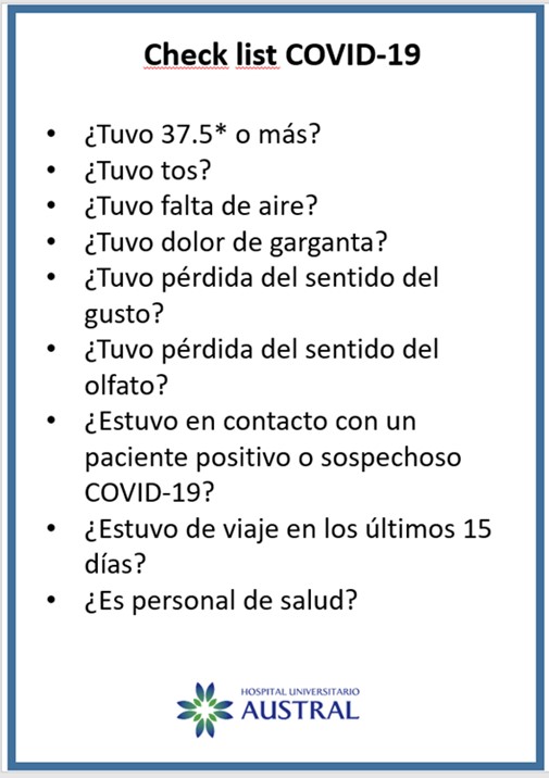 La tarde previa a la cirugia, el paciente recibira un llamado, desde el centro de atencion al paciente quirurgicos, donde sumado a las indicaciones prequirurgicas habituales se realiza el interrogatorio dirigido COVID.