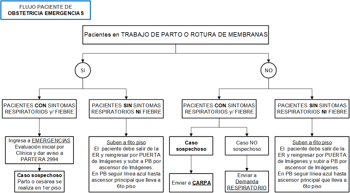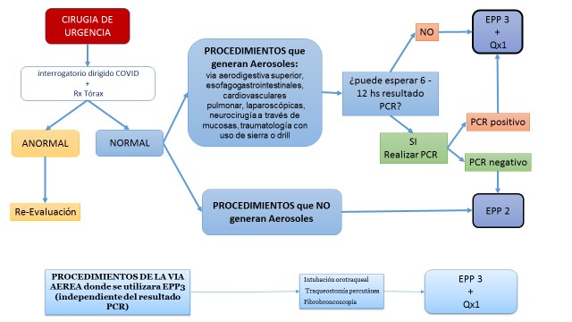 Los pacientes recibirán la evaluación pre quirúrgica habitual por médicos de servicio de emergencias según protocolo habitual. Se suma como requerimiento adicional la realizar de RX de tórax en todos los procedimientos e interrogatorio dirigido COVID-19. Si el paciente ingresa por una cirugía de urgencia pero el resultado de esta evaluación es negativo, el paciente no requiere PCR COVID-19 y se empleará EPP3 solo cuando lo indique el tipo de procedimiento.