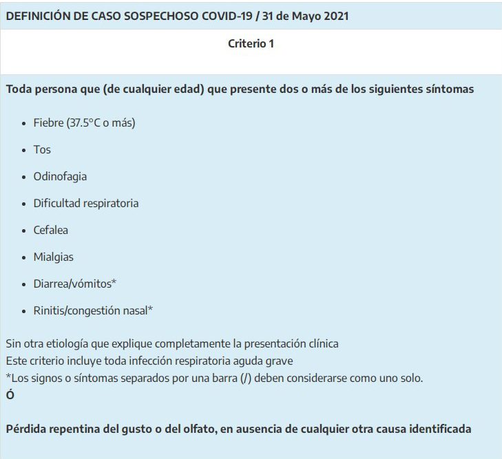 CRITERIO 1: Todo caso sospechoso que reúna 2 o más de los siguientes síntomas: fiebre, tos, odinofagia, dificultad respiratoria, vómitos/diarrea/cefalea/mialgias*, rinitis/congestión nasal*, y que en los últimos 14 días previos al inicio de los síntomas haya sido contacto estrecho de un caso confirmado o forme parte de un conglomerado de casos, con al menos un caso confirmado por laboratorio, sin otro diagnóstico definido.