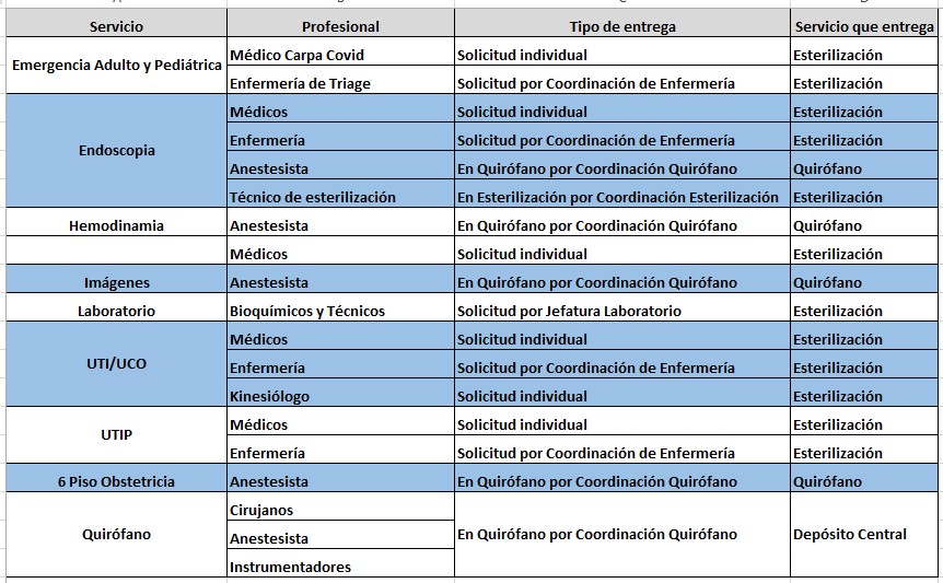 - La circulante, en la Antesala B, es la responsable de la limpieza del EPP utilizado (antiparras y máscaras faciales), la cual se realizará en el lavabo. La circulante será la encargada de que el Servicio de Limpieza, limpie el quirófano y será la última en retirarse del quirófano.