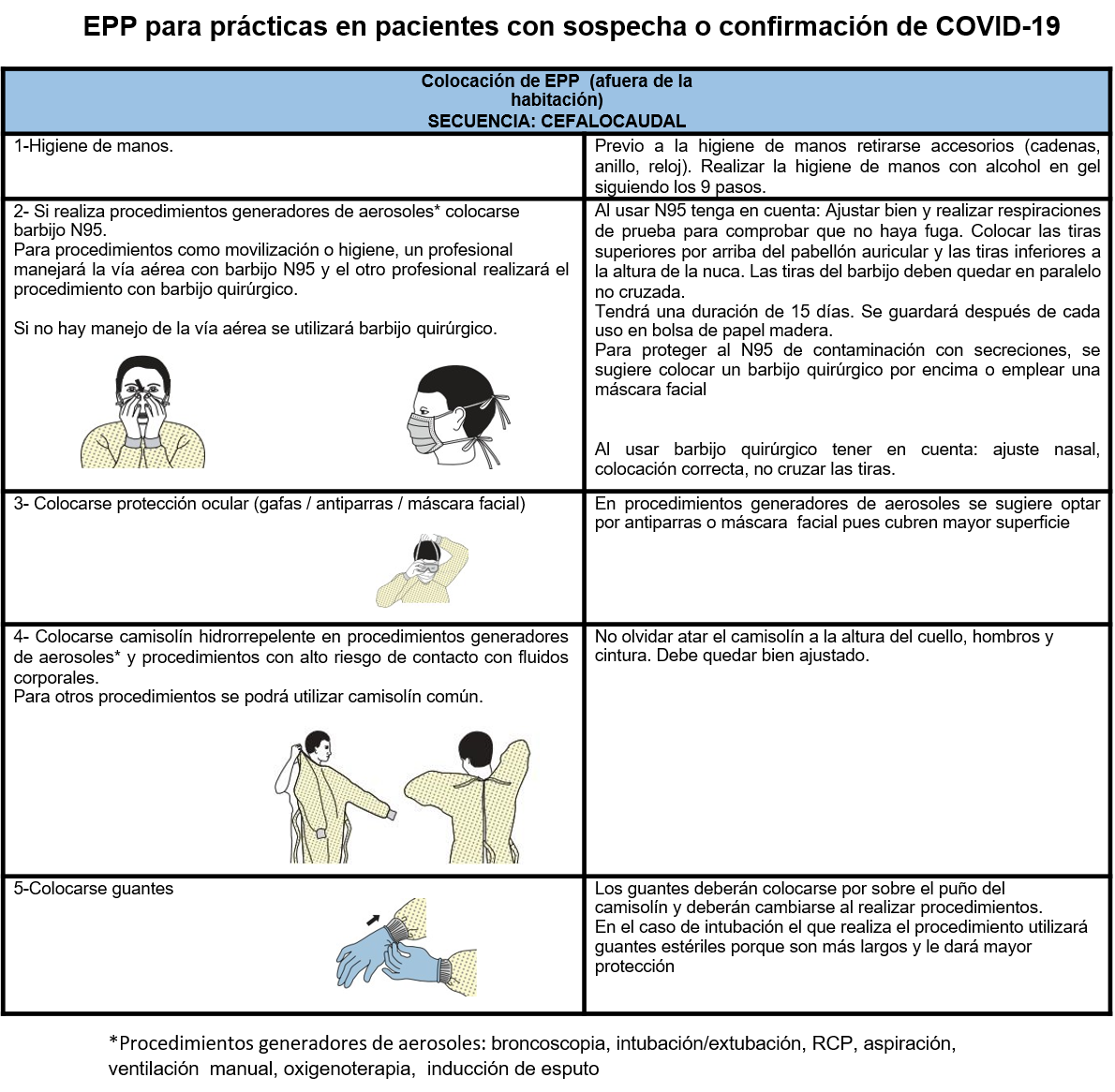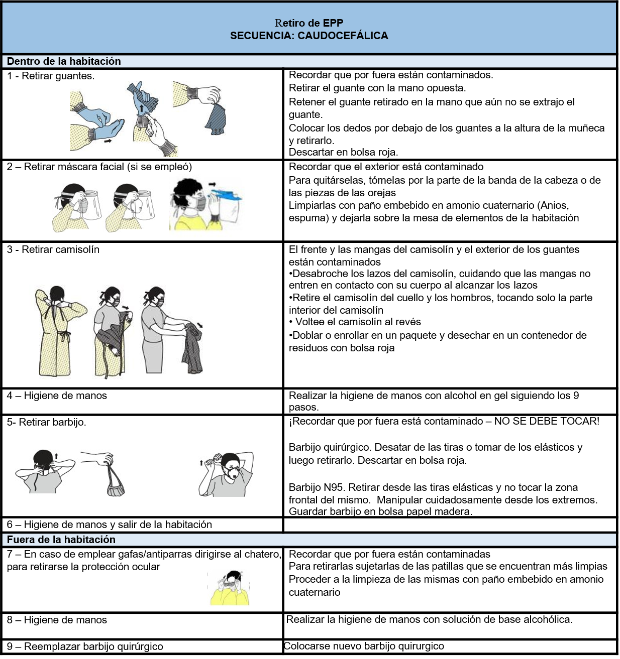 - El personal deberá colocarse: doble cofia, doble cubrecalzado, doble par de guantes estériles, camisolín hemorrepelente, barbijo N95 (SÓLO PARA CIRUGÍAS EN COVID-19 EN QUIRÓFANO 1), antiparras y cobertor facial. Es fundamental el entrenamiento del personal respecto de la colocación y retiro de los elementos de protección personal.