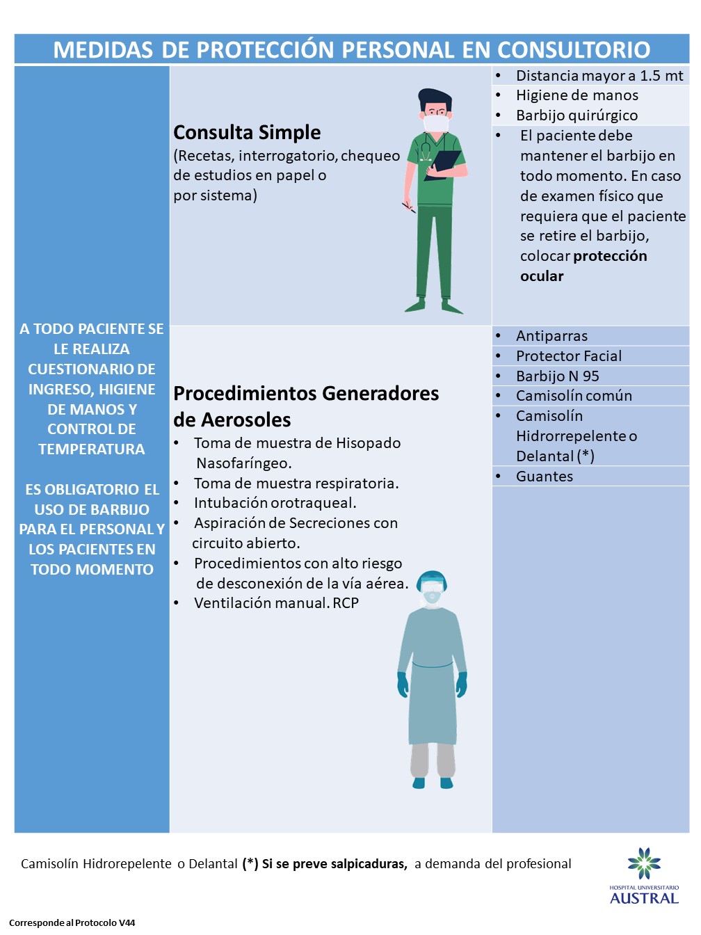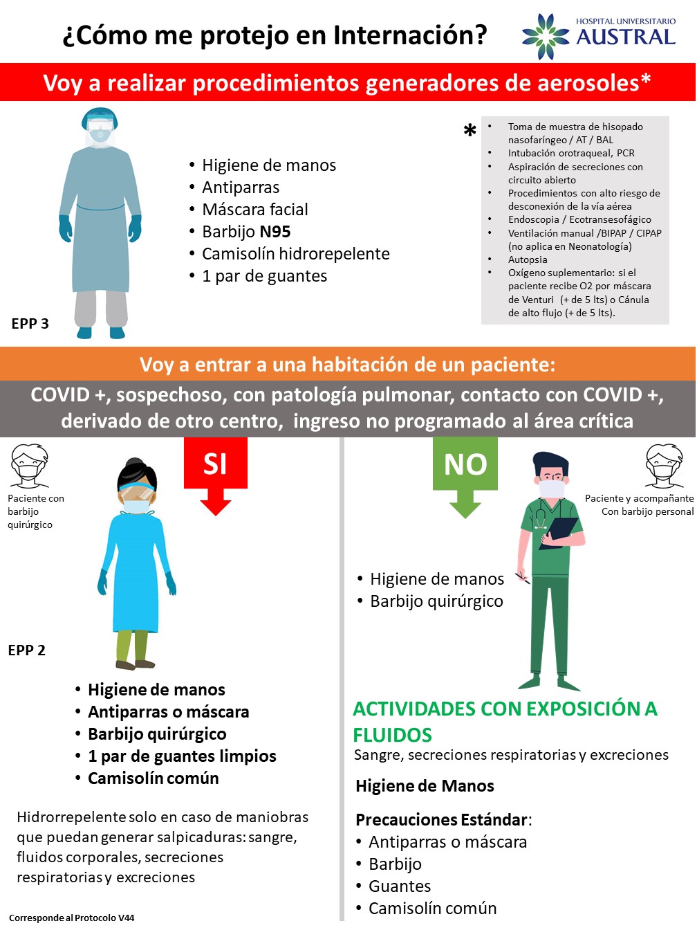 | Trasplante de órgano sólido y hematopoyético Cirugías aerodigestivas superiores Cirugías cardiotorácicas centrales Neurocirugías a través de mucosas | Esputo inducido Ventilación manual Ventilación no invasiva Intubación orotraqueal Extubacion Traqueostomía Fibrobroncoscopía Aspiración abierta de secreciones Resucitaciones cardiopulmonar |