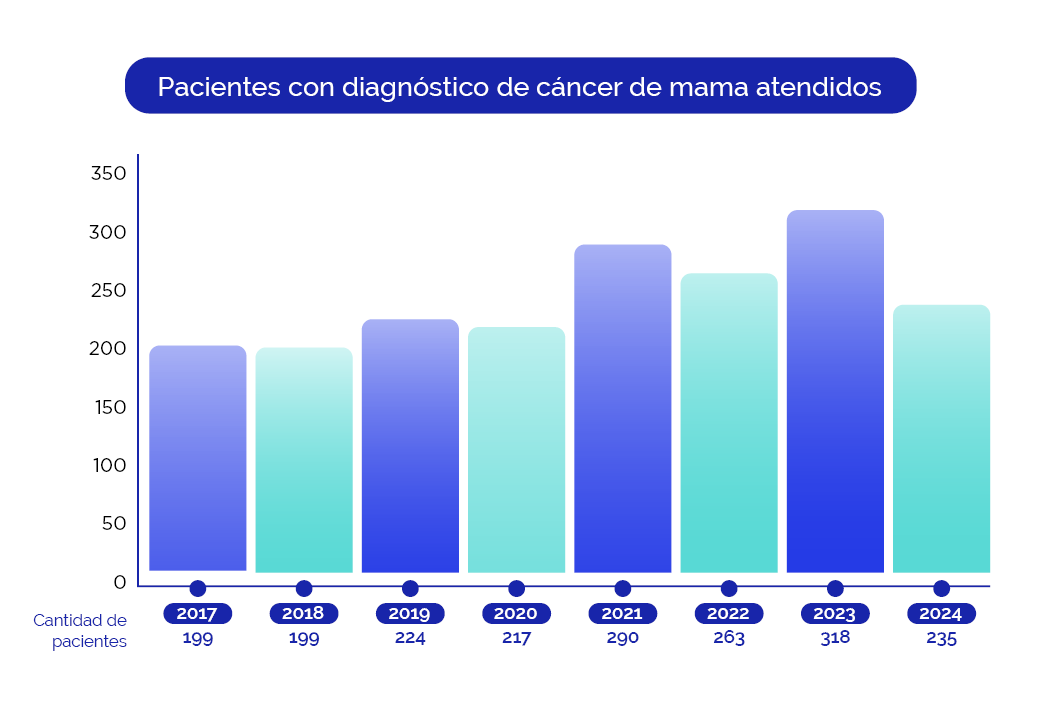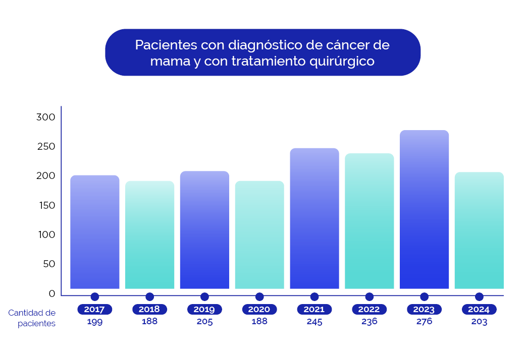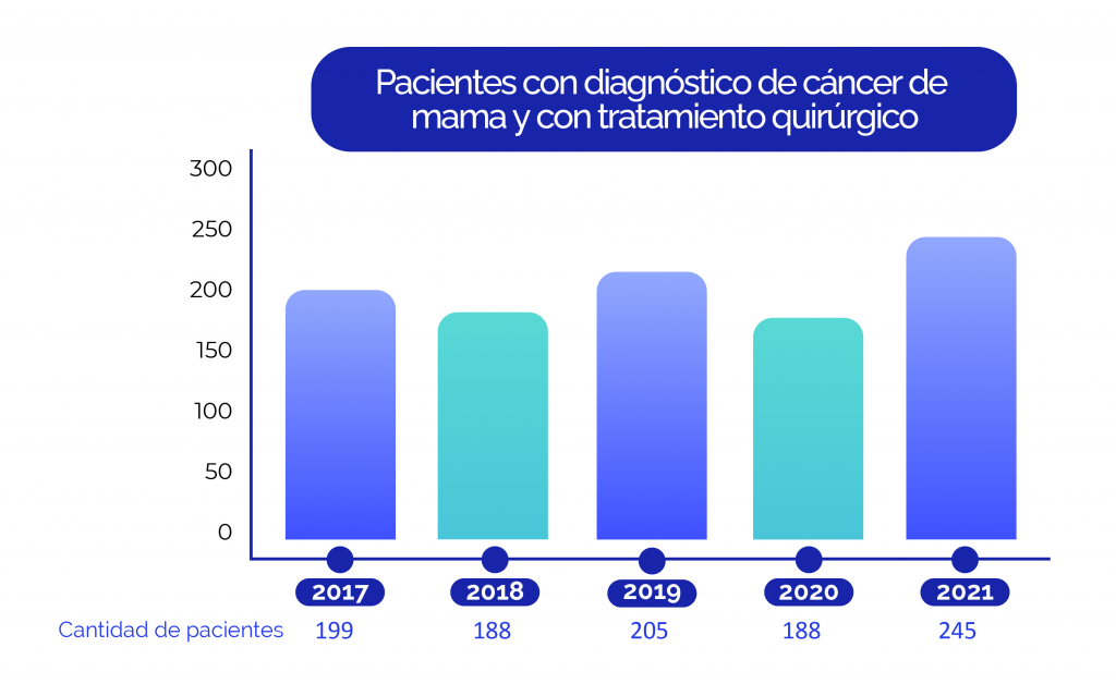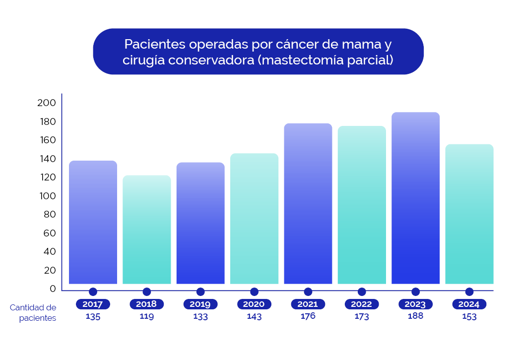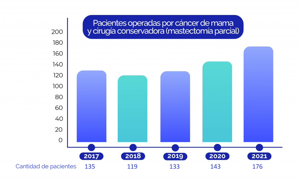 Cuenta con equipos de última generación en Diagnóstico por Imágenes (mamógrafo digital, tomosíntesis, resonancia magnética) y punciones mamarias (con laboratorio propio de Anatomía Patológica, lo que agiliza la obtención de los resultados). Nuestro equipo quirúrgico cuenta con formación en Cirugia Oncoplástica y ofrece todas las técnicas de reconstrucción mamaria, lo que permite elegir aquella más adecuada para cada paciente, así como minimizar las secuelas de una cirugía oncológica. Las pacientes que requieren tratamientos de Quimioterapia y/o Radioterapia también pueden realizarlos en el hospital. Las conductas sobre el tratamiento más adecuado para cada paciente se toman en el marco de un Comité Multidisciplinario en el que todos los especialistas aportan su conocimiento en la toma de decisiones.