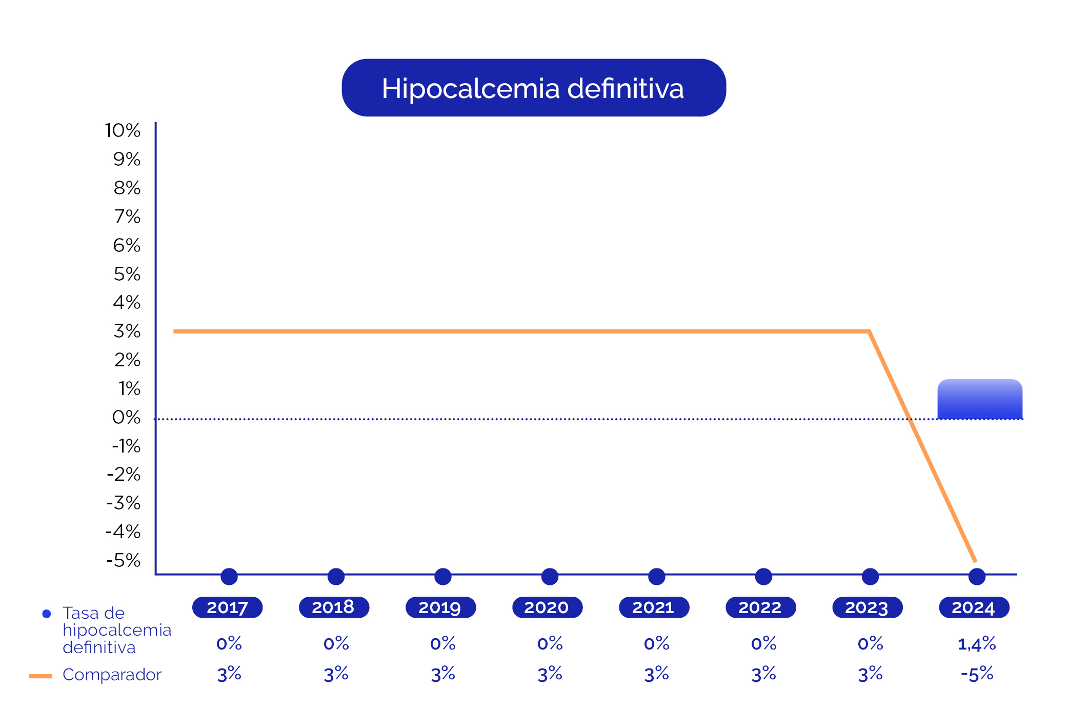 Hipocalcemia definitiva: es la disminución sostenida del nivel del calcio en sangre ocasionada por la alteración del funcionamiento de las glándulas paratiroides y que requiere recibir calcio en forma permanente.