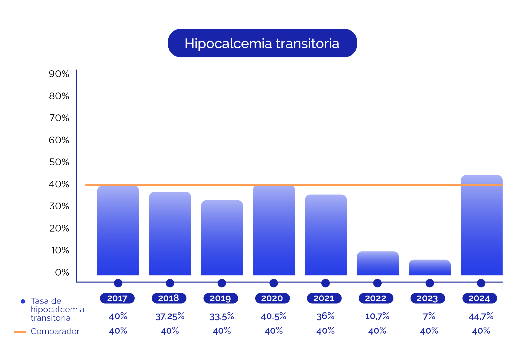 Hipocalcemia transitoria: es la disminución temporaria del nivel de calcio en sangre ocasionada por la alteración del funcionamiento de las glándulas paratiroides y que requiere recibir calcio por un tiempo limitado.