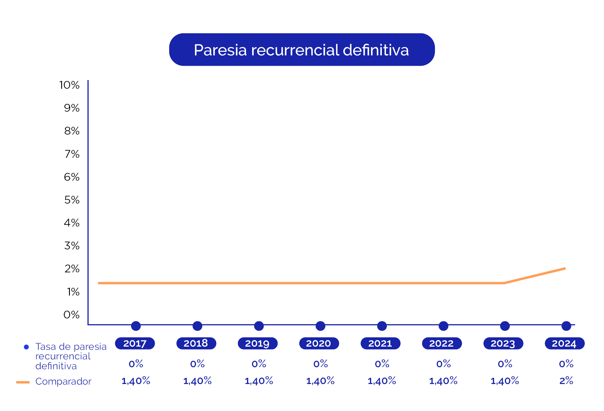 Paresia recurrencial definitiva: es la pérdida completa de la movilidad de la cuerda vocal ocasionada por alteración del nervio (recurrente) que controla su movimiento y que produce un cambio permanente en el tono de la voz.