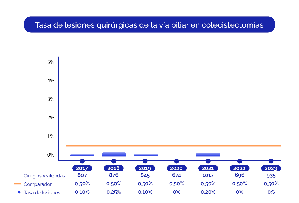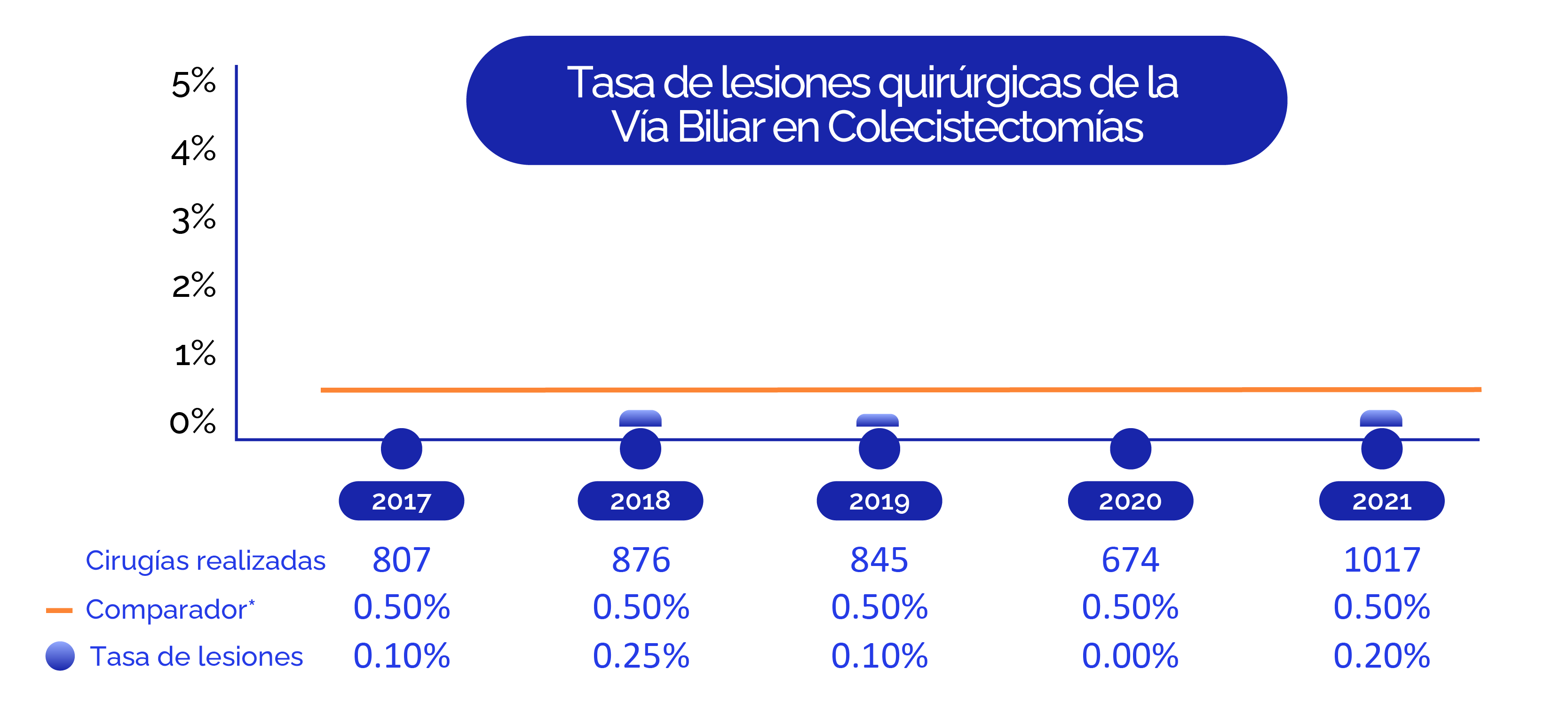 - Lesión Quirúrgica de la Vía Biliar: es la sección o lastimadura del conducto que comunica el hígado con el intestino (duodeno) por una mala interpretación de la anatomía del paciente sea por no contar con los elementos adecuados de visión, inexperiencia en el equipo quirúrgico o condiciones inflamatorias (agudas o crónicas) del paciente que llevan a una disposición no habitual de la vía biliar. Estas lesiones y su posterior reparación llevan a una temporaria alteración en la calidad de vida.