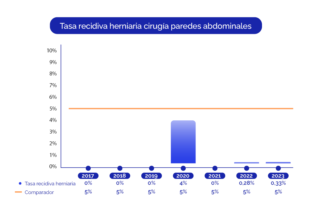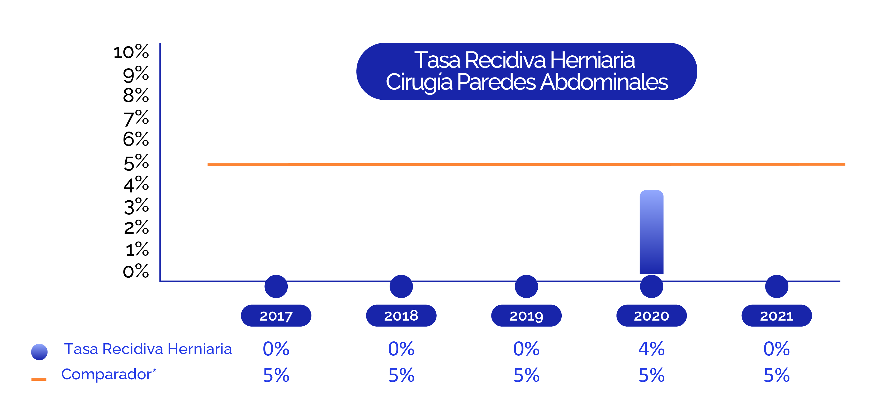 - Recidiva de patología parietal (hernia y eventración): es la reaparición del problema a nivel del plano muscular donde se realizó la cirugía y está relacionada a una inadecuada técnica quirúrgica. El presentar nuevamente este problema no deja de afectarle en la calidad de vida al paciente que los sufre y debe pensar que va a exponerse a una nueva cirugía para reparar el problema.