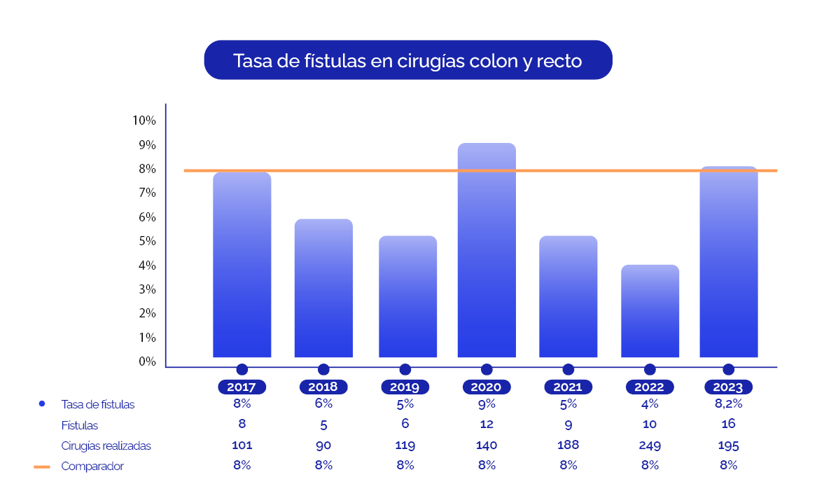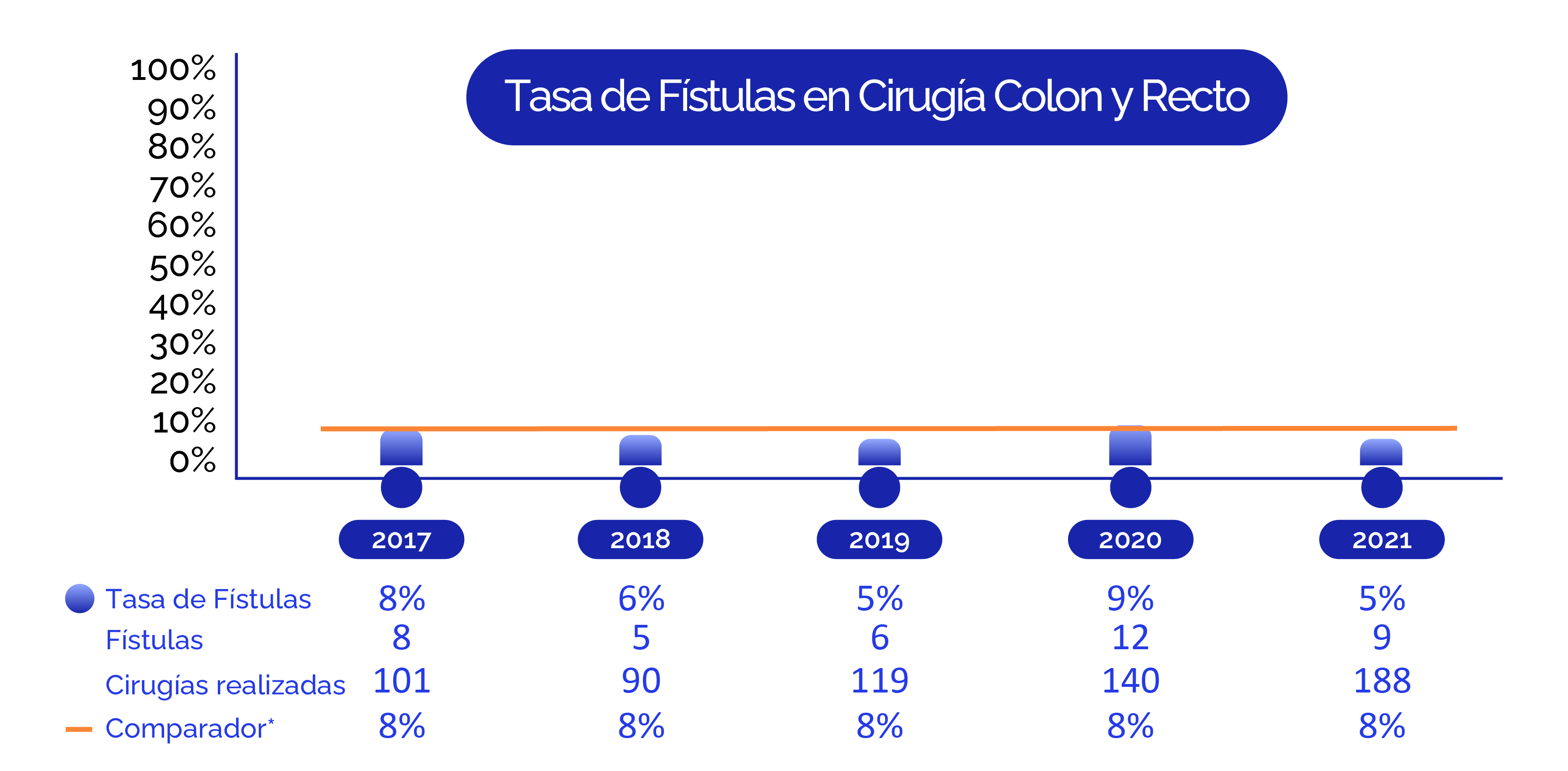 - Fístula Colónica: es la perdida del contenido intestinal en el lugar donde se cortó y volvió a unir el intestino (cirugía de urgencia o cirugía programada). Esto se debe a mala calidad en el material utilizado, falla en la técnica utilizada o patologías propias de cada paciente que llevan a los tejidos a no unirse adecuadamente. Esto lleva a tener una calidad de vida no óptima generando malestar psicofísico y no reincorporándose rápidamente a su vida habitual.