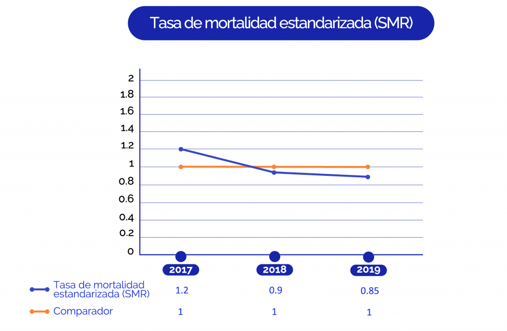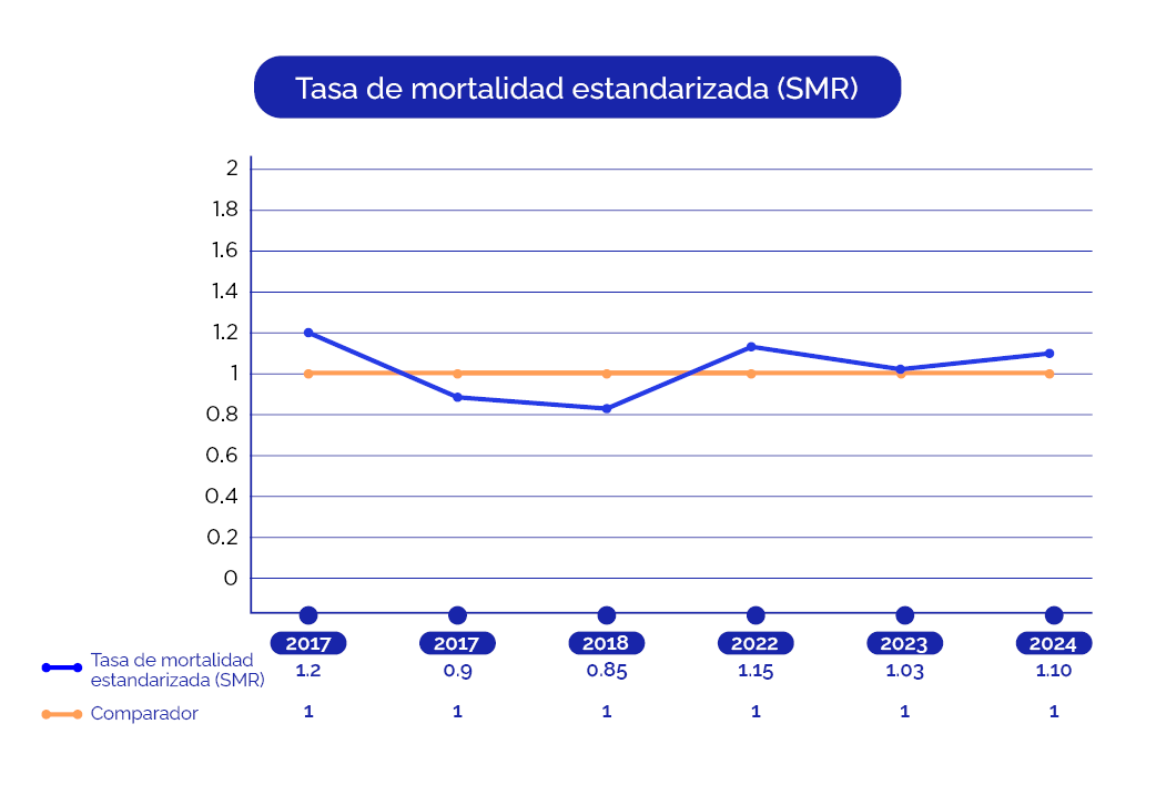 Como la mayoría de las muertes hospitalarias en pediatría ocurren en la UCIP, la mortalidad de la UCIP puede reflejar la atención médica de un hospital y la calidad y eficiencia en el manejo de niños críticos. Para esto es necesario comparar la mortalidad real con la mortalidad esperada. La mortalidad esperada se evalúa al ingreso de los pacientes a la UCIP. Según las características clínicas, se asigna un puntaje de riesgo de mortalidad a cada paciente a través de escalas validadas en el mundo y en el país. Periódicamente se promedian los puntajes de los pacientes y se compara el resultado con la mortalidad real de la unidad. La resultante de este promedio se denomina tasa de mortalidad estandarizada o SMR por sus siglas en inglés (SMR: mortalidad observada/mortalidad esperada). Una SMR menor a 1 quiere decir que la mortalidad es menor a la esperada, mientras que una SMR superior a 1 indica que la mortalidad en la UCIP es mayor a la esperada.