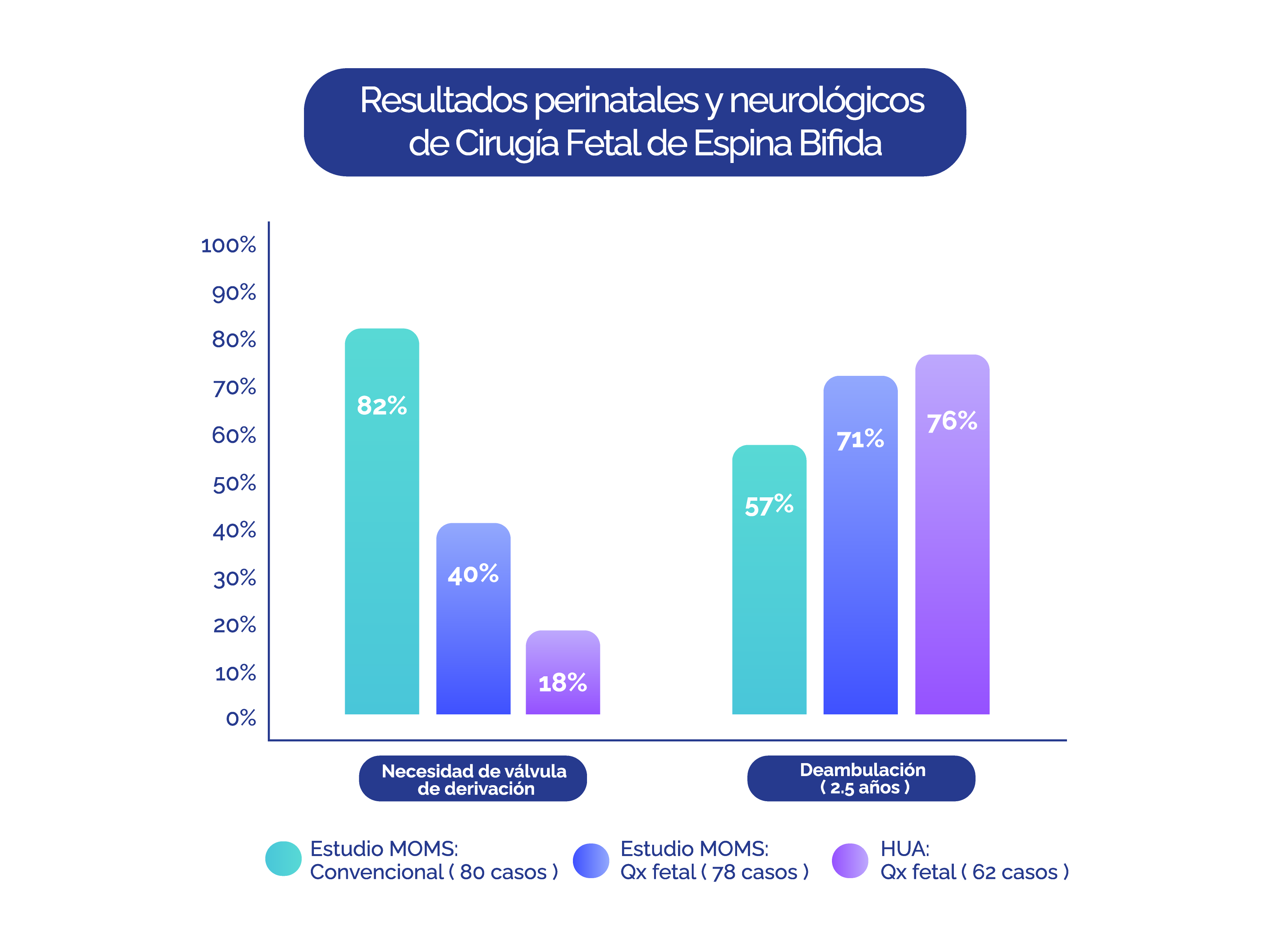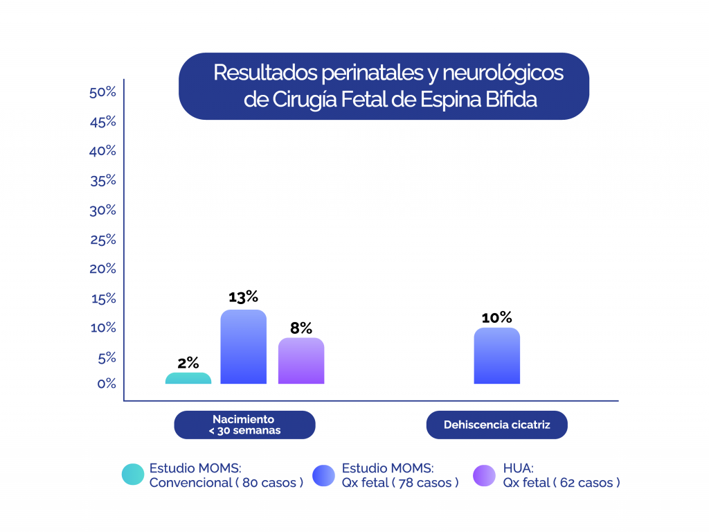 El Programa de Cirugía Fetal es uno de los más activos de Latinoamérica. Nuestros resultados de cirugía fetal de espina bífida fetal se encuentran dentro de los mejores del mundo, superando los del estudio MOMS (Adzick NS et al NEJM 2011). Dos marcadores importantes de morbilidad perinatal asociados a la cirugía fetal son la tasa de dehiscencia (apertura) de la cicatriz uterina (0% en nuestra serie) y el porcentaje de nacidos antes de las 30 semanas (prematuridad severa, <10% en nuestra serie).