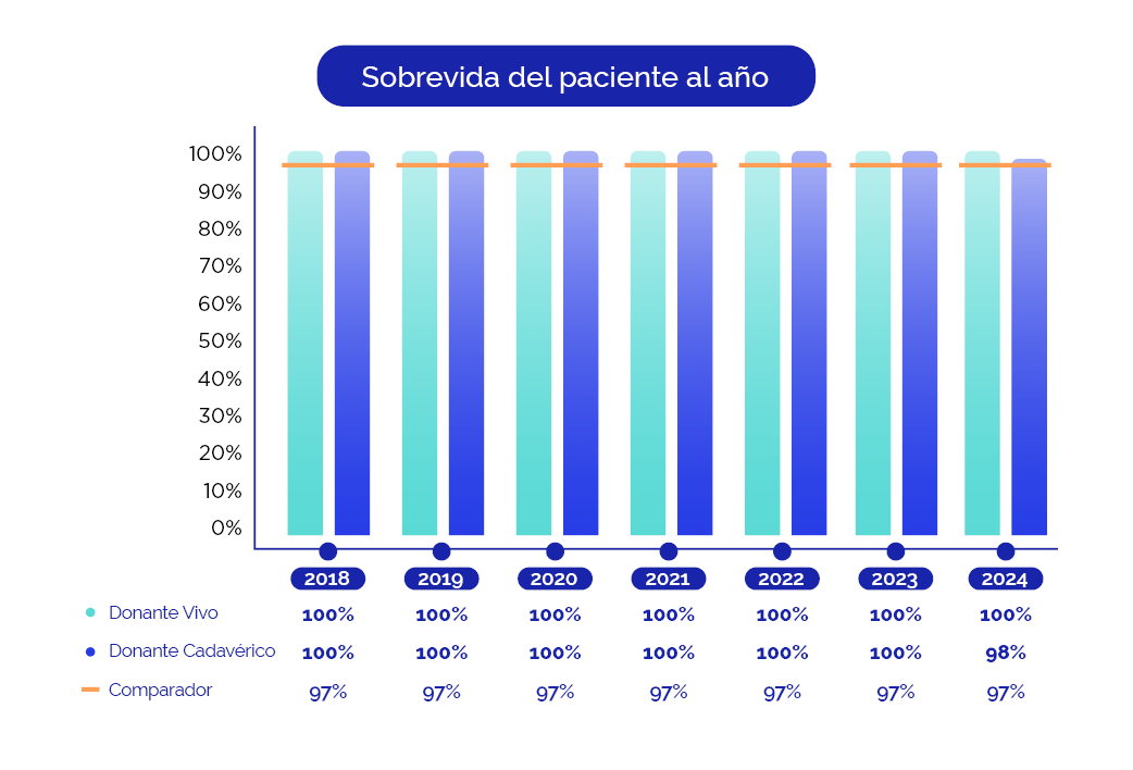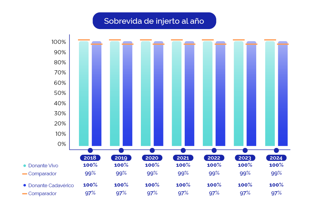 *La línea naranja representa el valor esperado según los estándares internacionales: Chua A, Cramer C, Moudgil A, Martz K, Smith J, Blydt-Hansen T, Neu A, Dharnidharka VR; NAPRTCS investigators. Kidney transplant practice patterns and outcome benchmarks over 30 years: The 2018 report of the NAPRTCS. Pediatr Transplant. 2019 Dec;23(8):e13597. doi: 10.1111/petr.13597. Epub 2019 Oct 27. PMID: 31657095. Porcentajes mayores a los estándares implican mejores resultados.