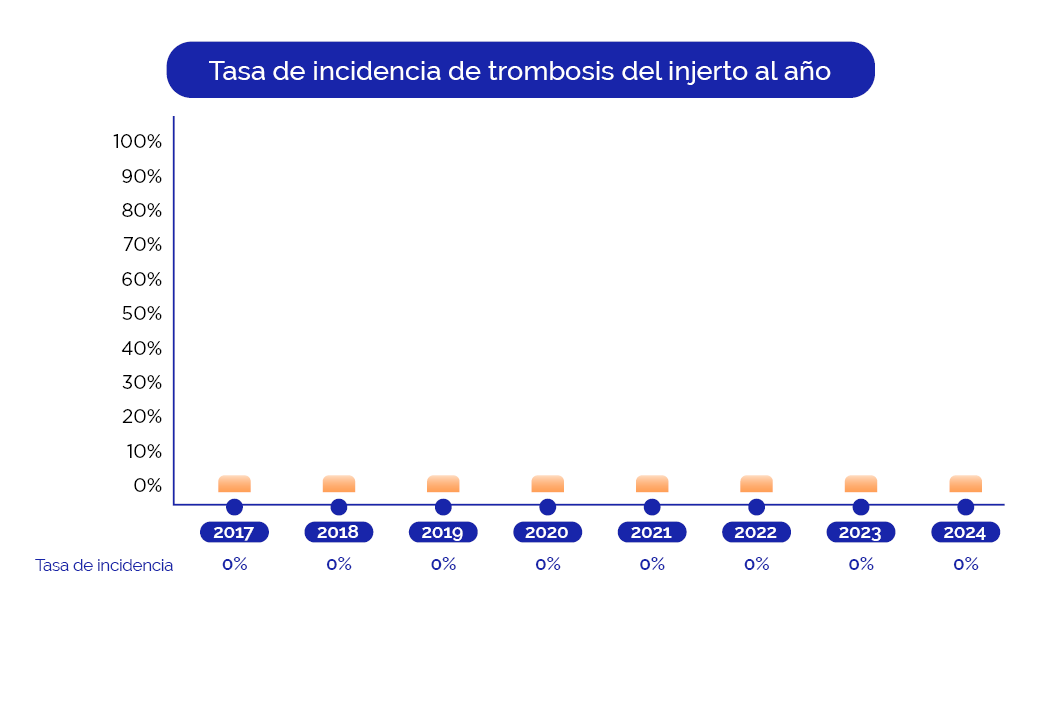 La Unidad de Trasplante Renal Pediátrico compara sus resultados con estándares internacionales, donde el resultado de Incidencia de trombosis en pacientes de hasta 20 kg es del 0-10%.