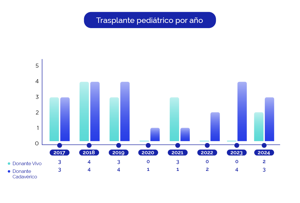 Desde el 2012 a la actualidad, se realizaron 51 trasplantes pediátricos de los cuales 12 fueron en pacientes que al momento del trasplante pesaban 15 kg o menos. Hasta el momento, el paciente con menor peso fue 10,800 g y, el paciente de menor edad fue de 2 años y 4 meses.