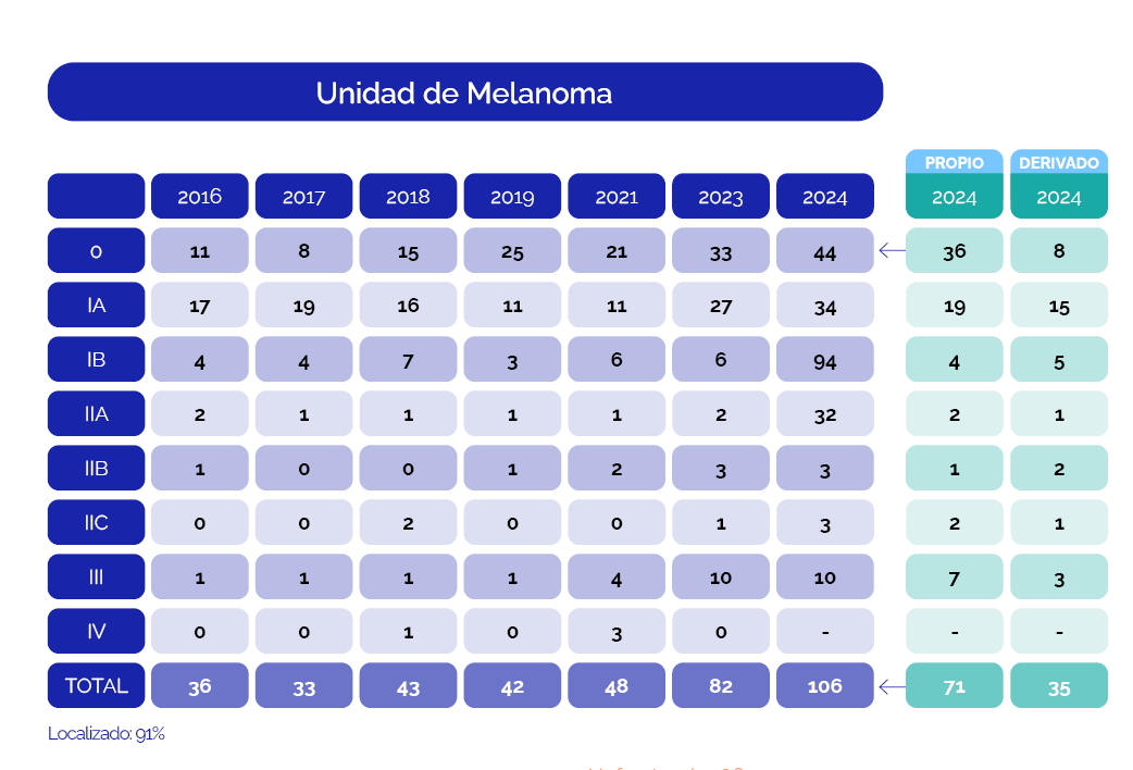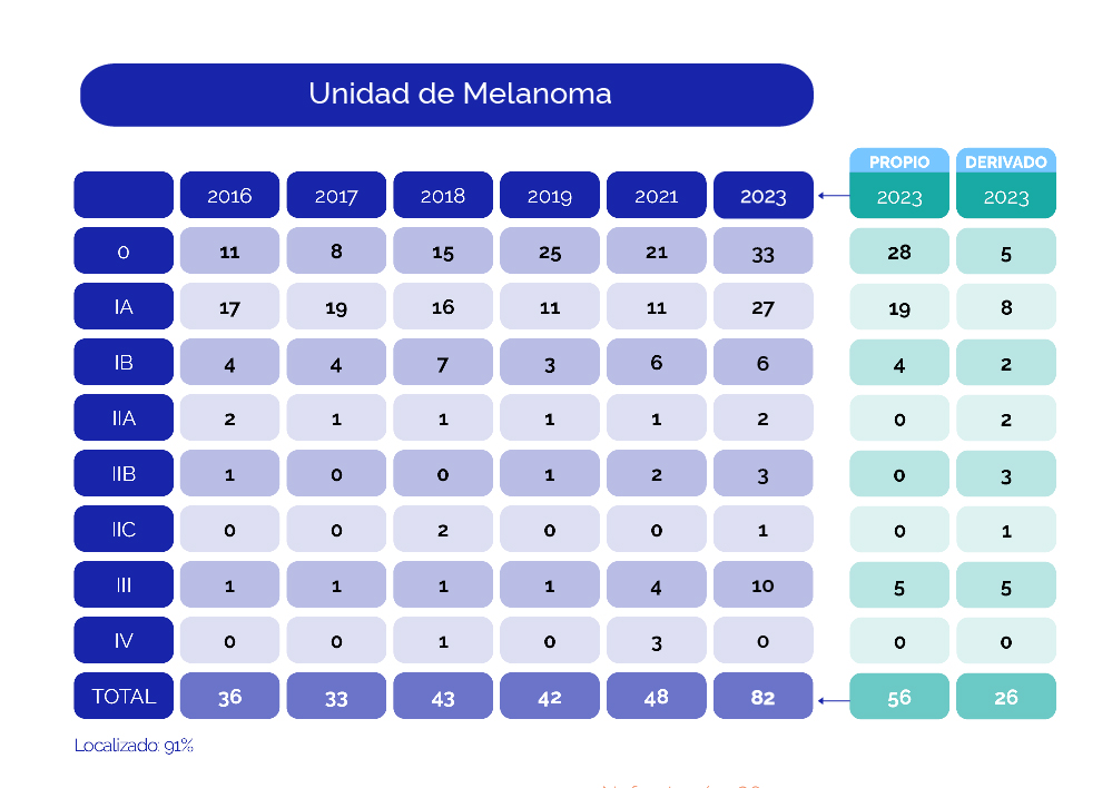 En la Unidad de Melanoma del Servicio de Dermatología, perteneciente al Centro de Cáncer Cutáneo del Hospital Universitario Austral, durante 2023, se diagnosticaron 56 melanomas nuevos de los cuales el 91 % fue en etapa temprana (localizada).