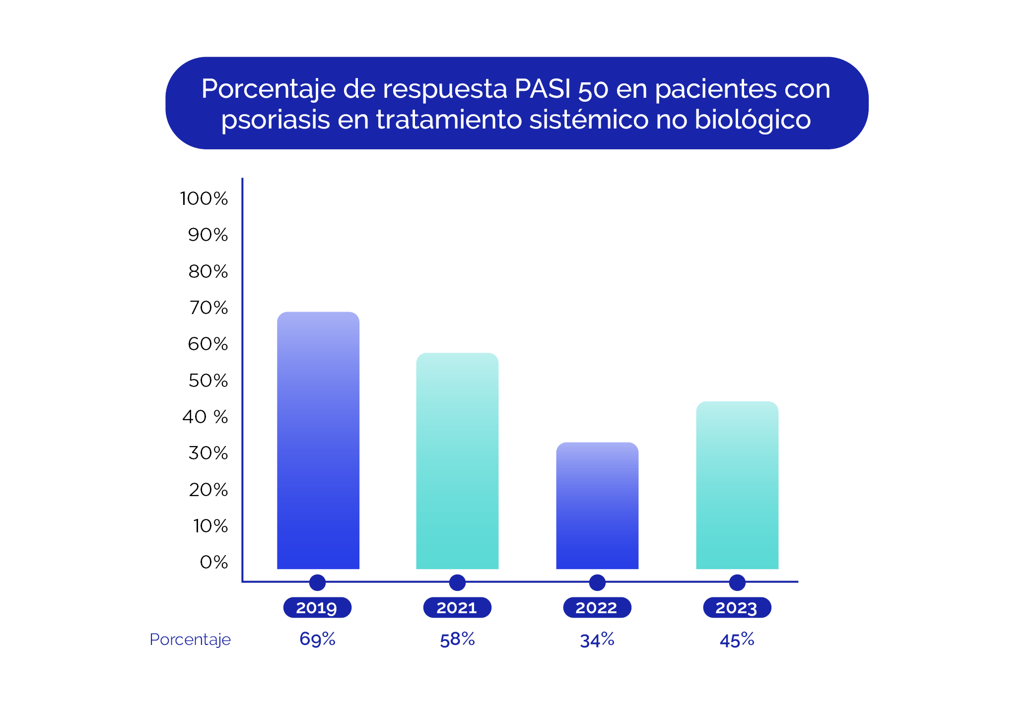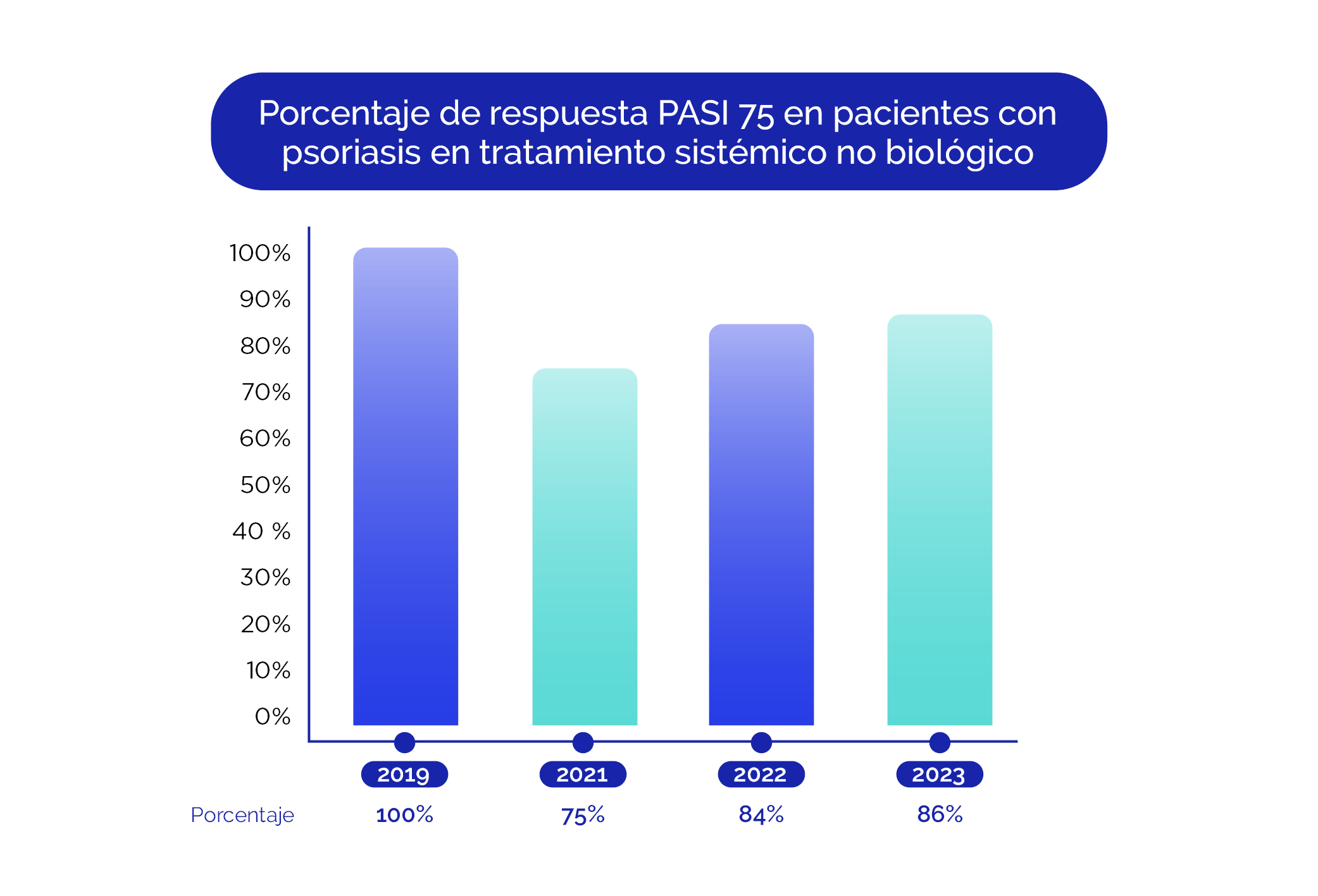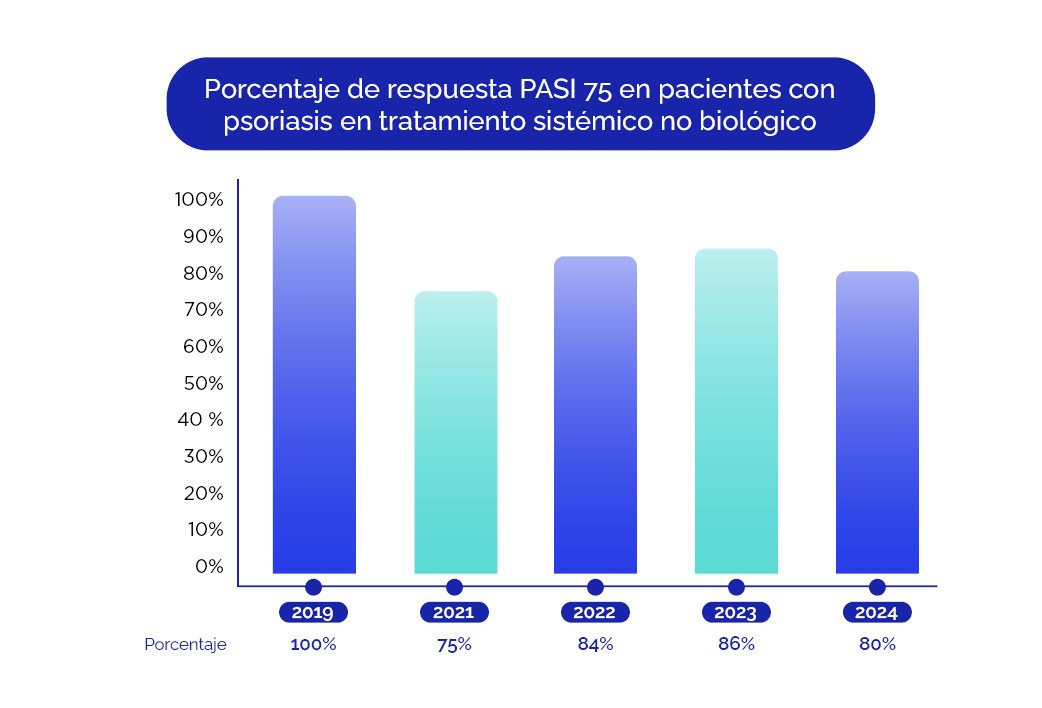 En 2023, el 86 % de los pacientes en tratamiento biológico atendidos en nuestra Unidad presentaron un PASI 75 a las 16 semanas, mientras que el 45 % de los pacientes en tratamiento con otros sistémicos no biológicos alcanzaron un PASI 50 en el mismo lapso. (3 y 4).