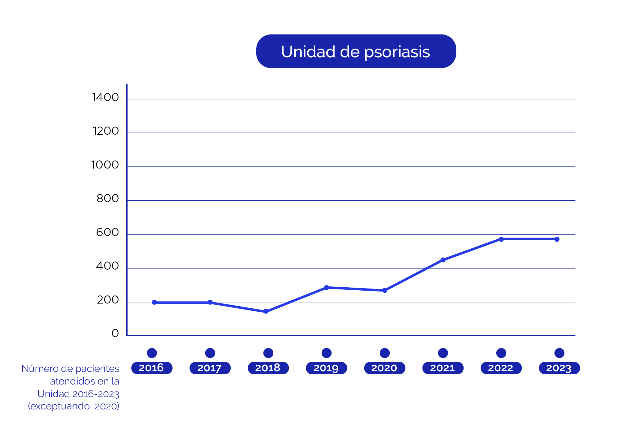 Teniendo en cuenta los pacientes atendidos, la Unidad de Psoriasis ha tenido un crecimiento constante, llegando a atender a más de 500 pacientes durante el año 2023. (1)