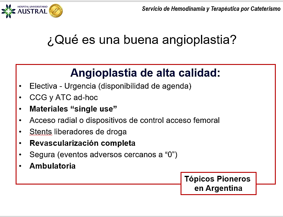Esta modalidad de tratamiento ha permitido el desarrollo del Programa de Angioplastia Coronaria Ambulatoria desde el mes de septiembre del año 2009 y que en la actualidad ha logrado con éxito el tratamiento de más de 850 pacientes, siendo pioneros en Argentina del alta hospitalaria el mismo día tras la intervención coronaria. Esta experiencia acumulada, ha hecho posible continuar con el cuidado y atención de pacientes en épocas sanitarias de máximo compromiso de camas para pacientes sin enfermedades cardiovasculares (Pandemia COVID – 19).
