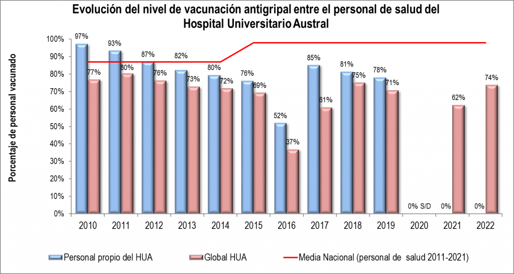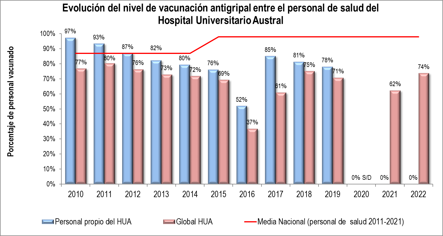 Desde la pandemia de gripe H1N1 el Hospital Universitario Austral se encuentra comprometido en alcanzar el máximo nivel de adherencia a la vacunación antigripal entre su personal. Si bien esta recomendación resulta difícil de cumplir en la medida que nos alejamos de la pandemia continuamos trabajando para mantener el nivel logrado.