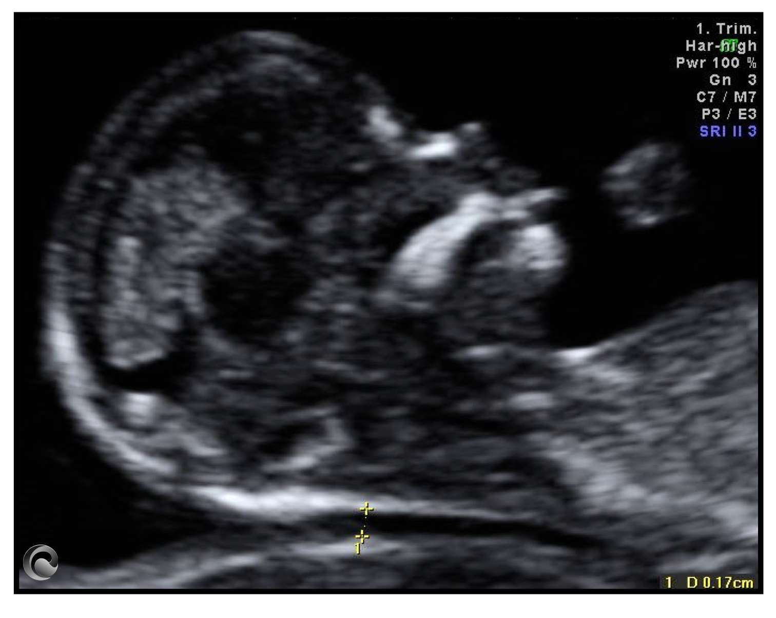 Durante la ecografía mediremos la longitud del bebé y la translucencia nucal (grosor de la piel de la nuca). Cuánto mayor es el valor de la translucencia, mayor es la probabilidad de enfermedades cromosómicas como las trisomías, malformaciones congénita y muchos síndromes genéticos. También evaluamos el desarrollo de los huesos de la nariz (un 60% de los fetos con síndrome de Down tiene nariz pequeña y un desarrollo más lento de los huesos nasales). Adicionalmente, verificamos el normal funcionamiento de la válvula derecha del corazón (llamada tricúspide) y el flujo sanguíneo a través de una pequeña vena en el hígado del bebe llamada ductus venoso.
